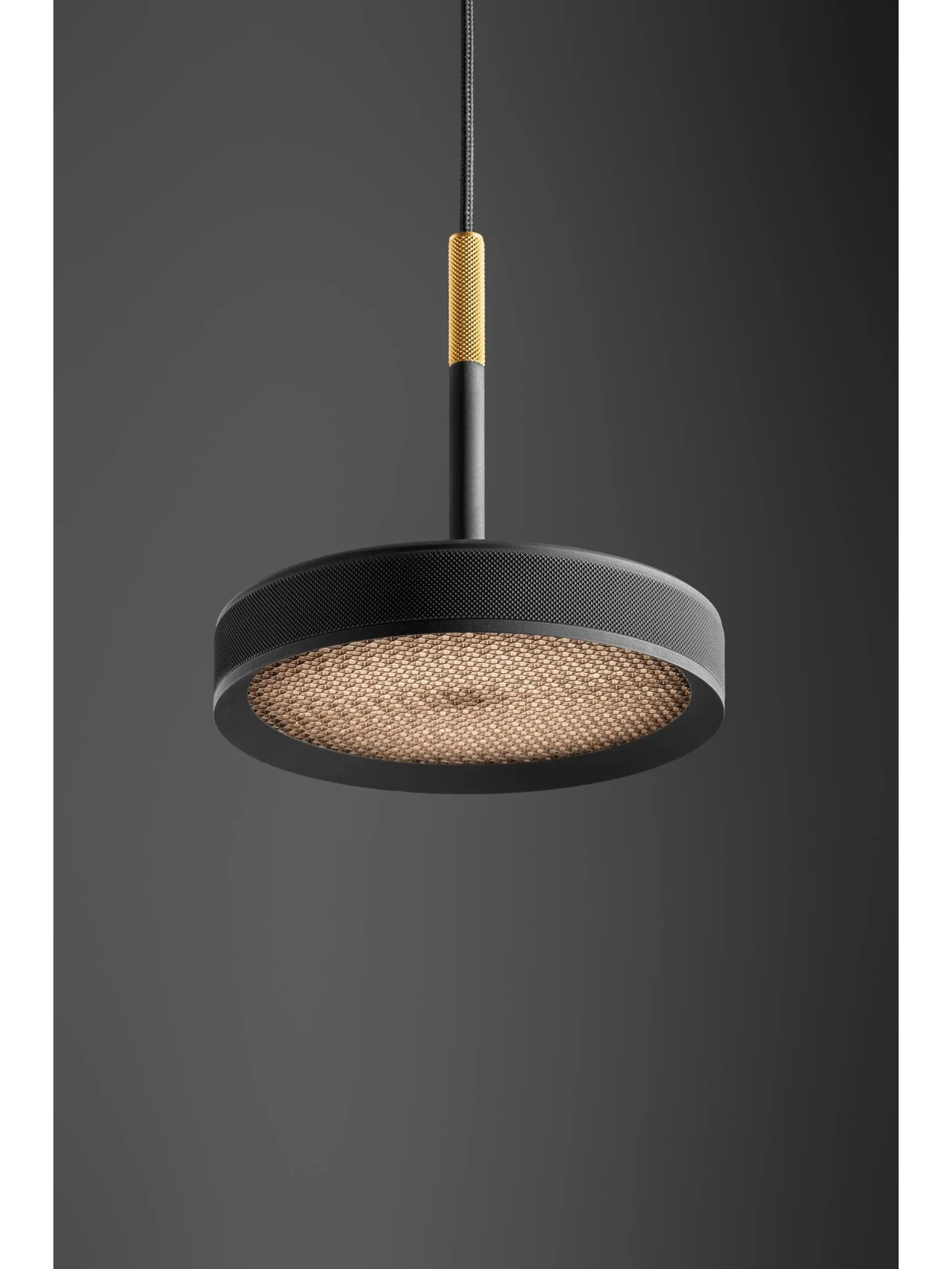 Overfly di Olev è una lampada a sospensione in alluminio e metacrilato, finitura nera ultra opaca. Emissione luminosa potente verso il basso, con filtro a nido d’ape anti-abbagliamento. Incisioni geometriche a trama incrociata e lavorazione artigianale per un design elegante, leggero e raffinato. Disponibile con rosone e stelo neri o con stelo dorato.