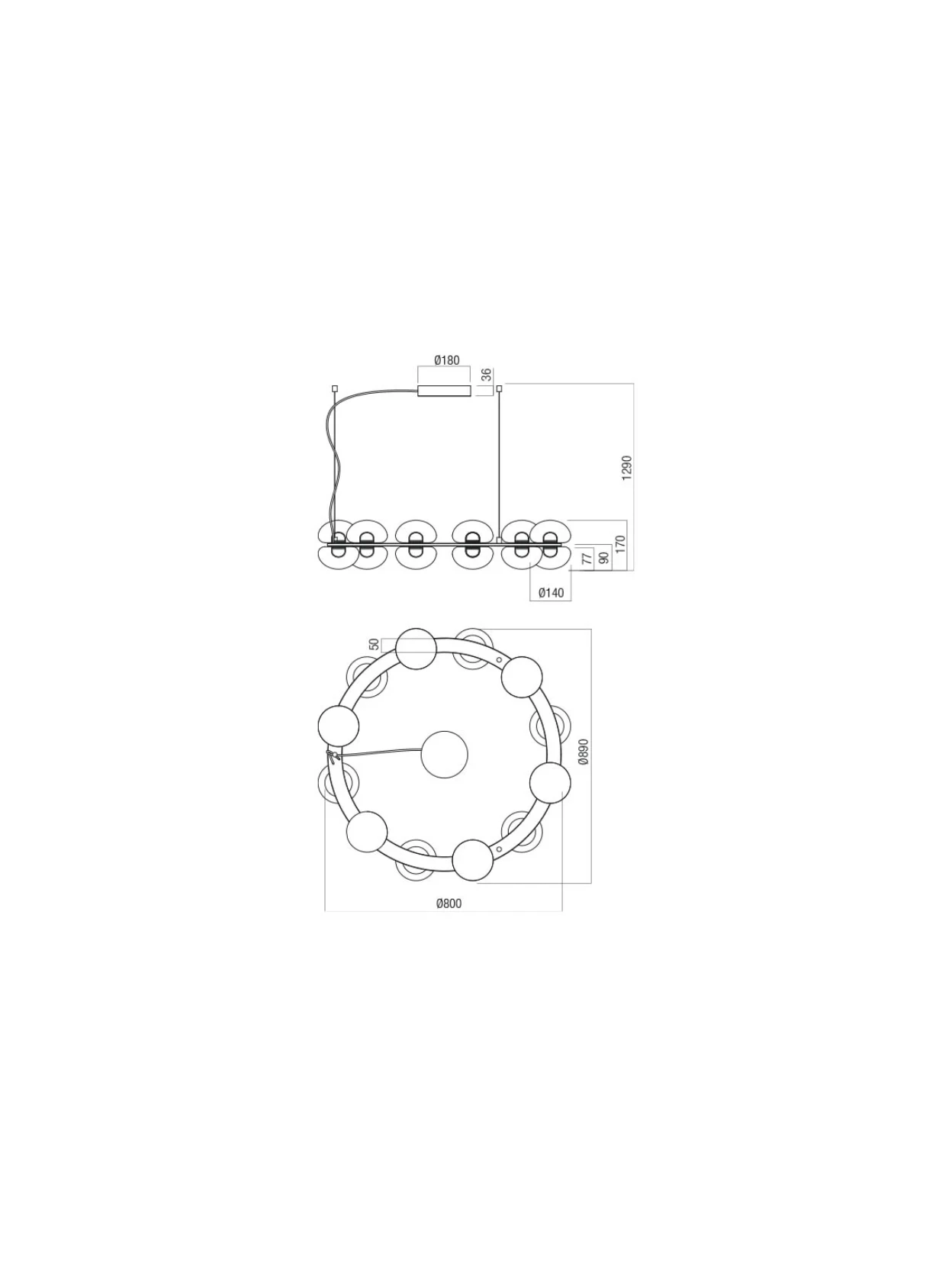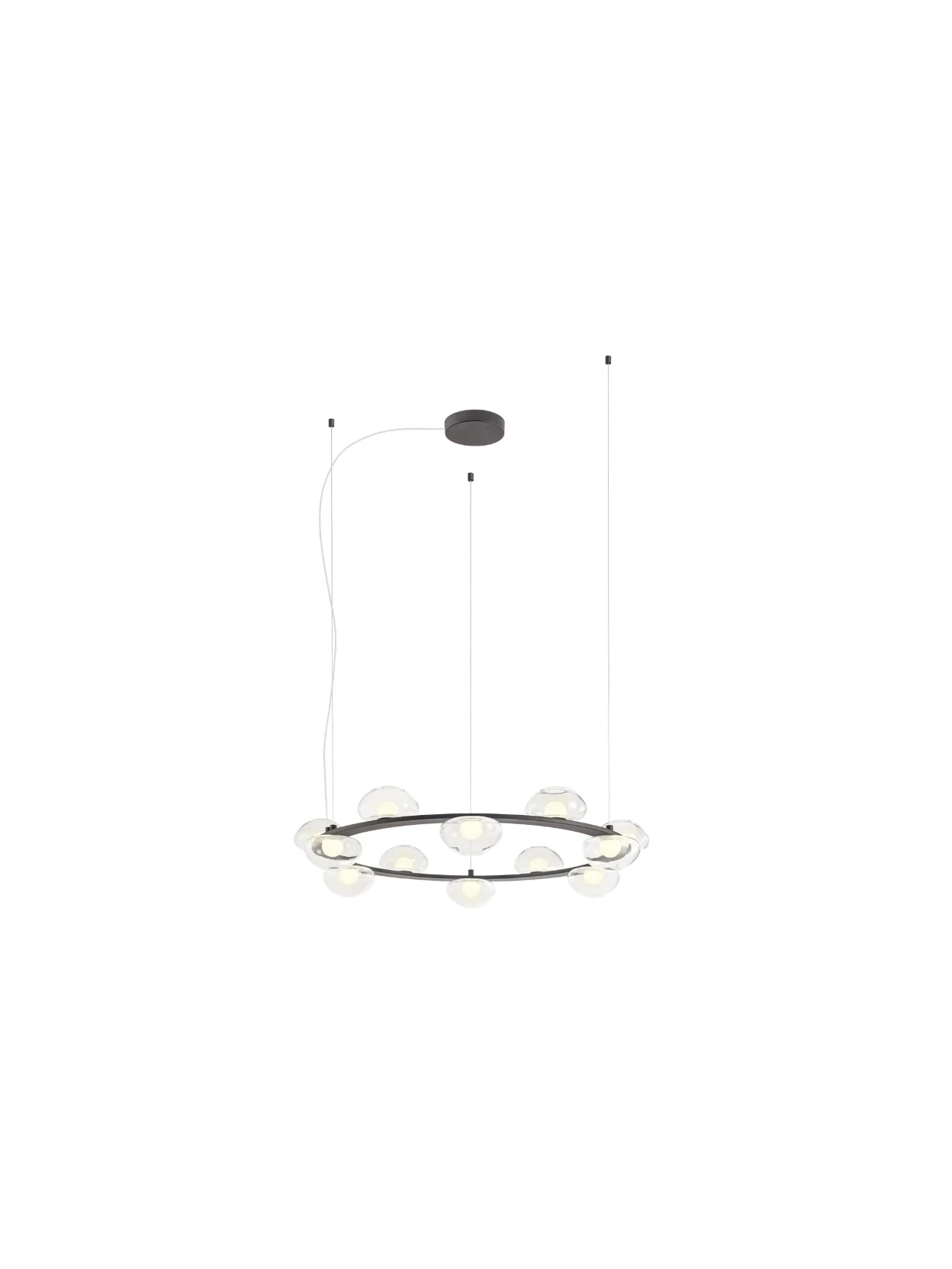Sinclair Circolare di Redo Group è una sospensione LED da interno in metallo verniciato nero opaco, con diffusori in vetro Pyrex bianco satinato e trasparente, disponibile nelle versioni a 6, 8 o 12 globi. Offre luce calda 3000K, alta resa cromatica CRI 93, regolabile tramite dimmer TRIAC e prestazioni luminose fino a 7791 lm, ideale per ambienti di design eleganti e contemporanei.