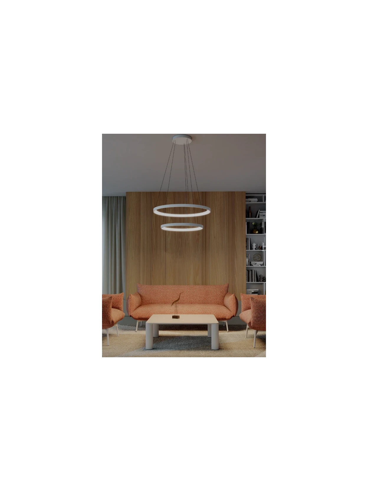 Iconic di Redo Group è una lampada a sospensione doppia per ambienti interni, dotata di due anelli luminosi con LED SMD ad alta efficienza. Ideale per soggiorni, sale riunioni o spazi moderni, offre controllo della temperatura colore (da bianco caldo 3000K a bianco neutro 4000K) e dimmerazione a 3 step tramite interruttore. Realizzata in alluminio e metallo verniciato bianco opaco, con diffusori in acrilico bianco opale per una luce morbida e uniforme. Tensione: 220–240V, 50/60Hz.