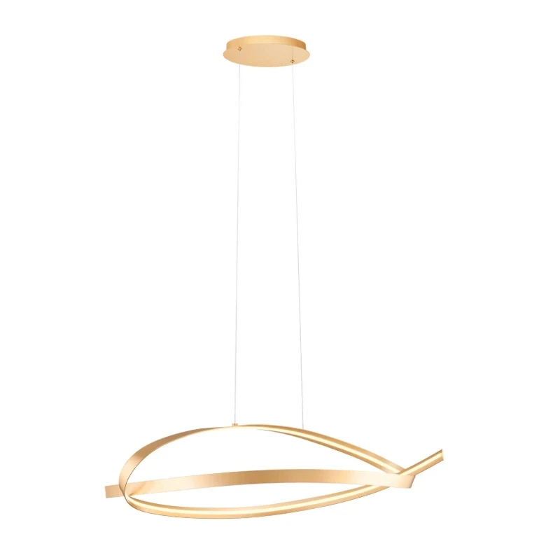Lampada LED a sospensione circolare con struttura in metallo e alluminio oro opaco. Diffusore in PVC bianco.