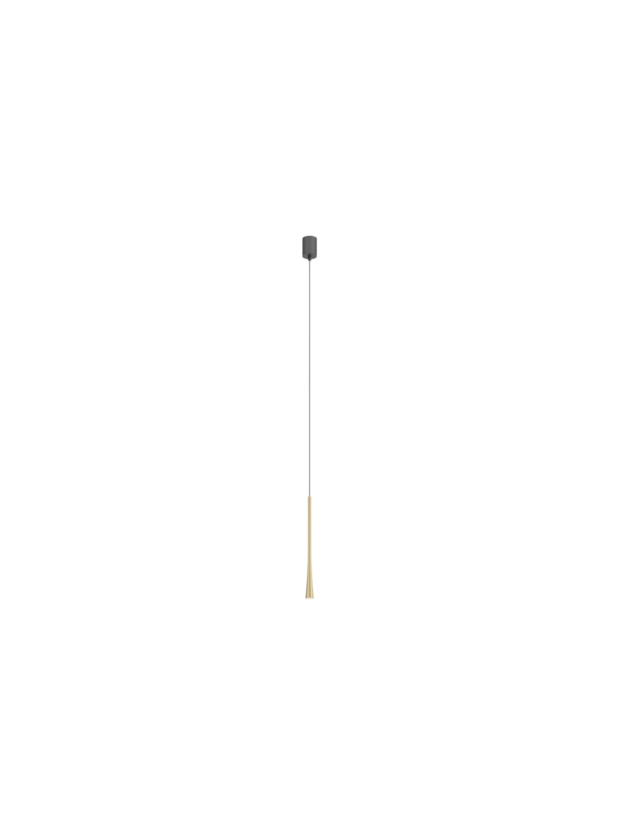 Lampada LED a sospensione con struttura in estruso di alluminio oro opaco. Diffusore in policarbonato trasparente.