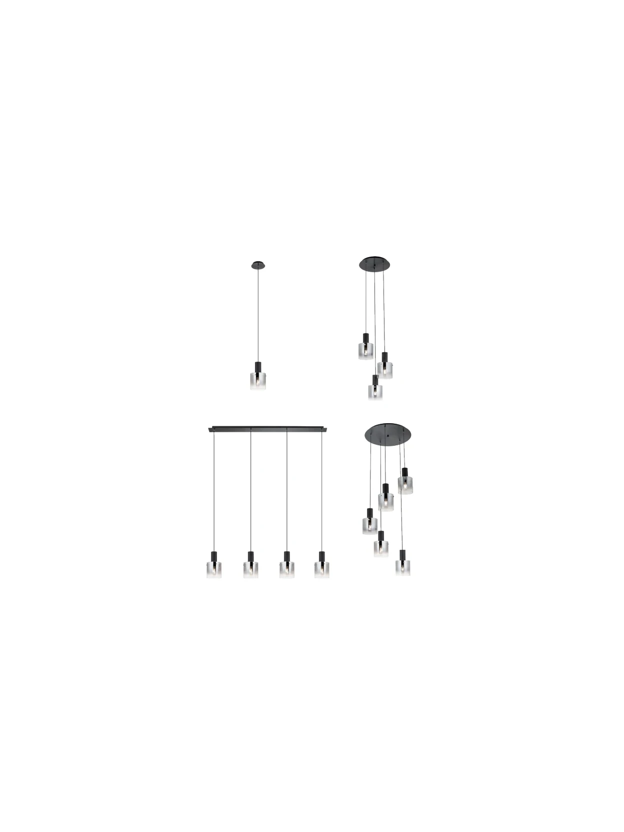 Lampada a sospensione multipla con struttura in metallo e alluminio anodizzato nero e diffusori in vetro sfumato fumè.