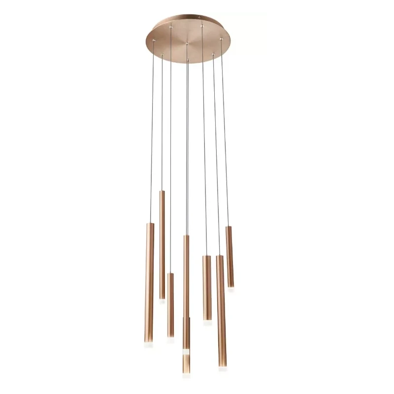 Madison di Redo Group è una lampada a sospensione multipla che si distingue per il suo stile minimalista ed elegante. La struttura è realizzata in metallo e alluminio spazzolato con finitura anodizzata rame opaco, mentre i diffusori in acrilico trasparente esaltano la purezza della luce, rendendola ideale per ambienti moderni ed essenziali. È equipaggiata con un LED SMD 3030 da 4W che emette una luce calda a 3000K. Il flusso luminoso del LED è di 450 lumen, con una resa effettiva di 272 lumen a livello di apparecchio. La lampada ha un CRI di 80. Non è dimmerabile, funziona con una tensione di 220–240V a 50/60Hz, ed è certificata in classe di protezione I con grado IP20.