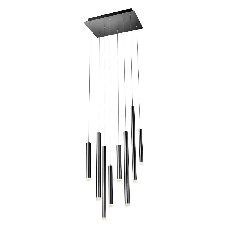 Lampada a sospensione multipla realizzata in metallo e alluminio spazzolato anodizzato nero opaco e diffusori in acrilico trasparente.