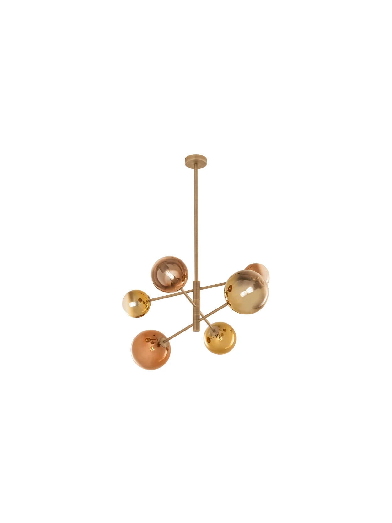 Lampada a sospensione con struttura in metallo in finitura ottone anticato opaco e diffusori in vetro pyrex in finitura sfumata a specchio oro e caffè.