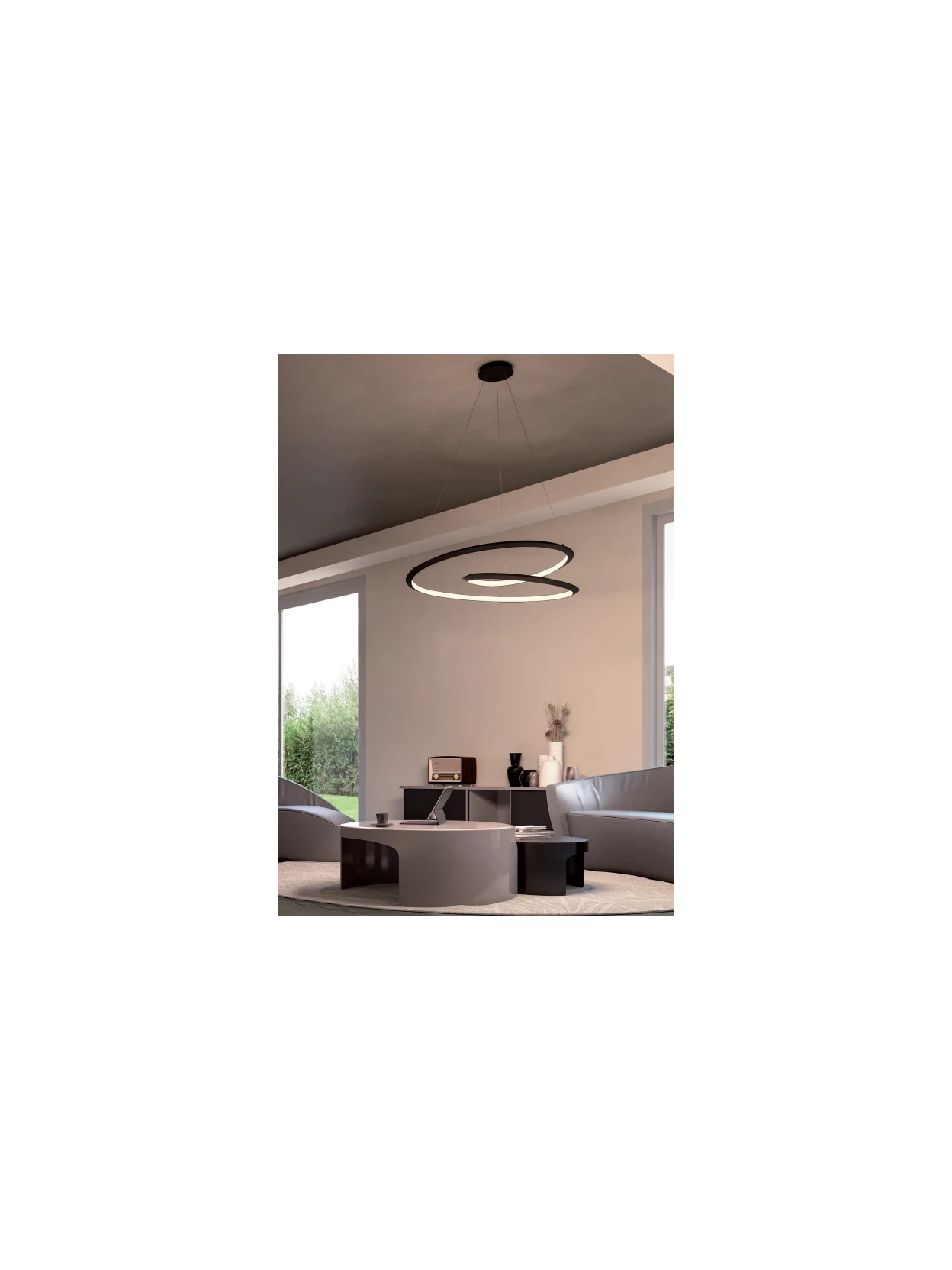 Lampada a sospensione con LED SMD integrato e selettore di temperatura colore, per adattare la luce all’atmosfera desiderata. Struttura in metallo e alluminio verniciata a polveri in elegante bianco opaco, con diffusore in PVC bianco per una distribuzione uniforme della luce.