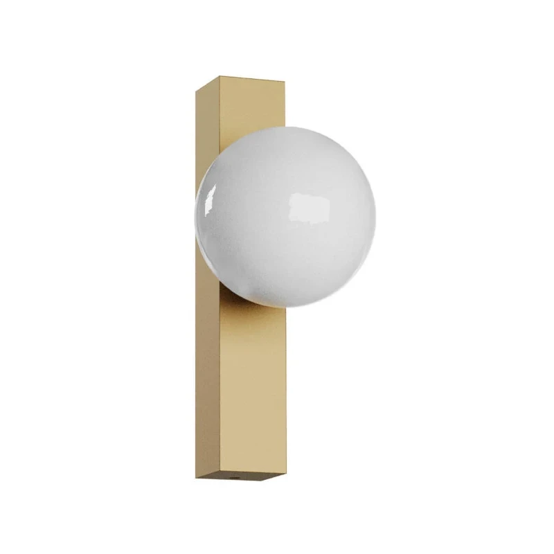 Applique Goji con struttura in metallo e alluminio oro opaco e diffusore in vetro soffiato opale. LED SMD 3000K, 6,3W, CRI ≥90 e flusso luminoso fino a 589 lm. Elegante e raffinata, perfetta per valorizzare ogni ambiente interno.
