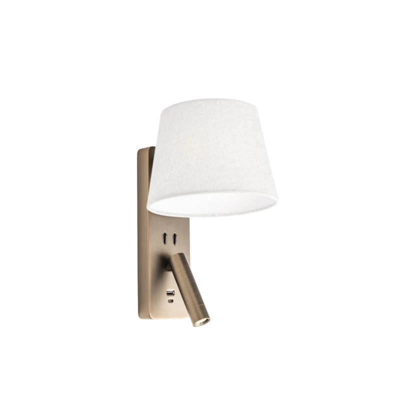 La lampada da parete Nemia di Redo Group in elegante bronzo antico unisce stile classico e funzionalità moderna. Dotata di faretto orientabile con LED BRIDGELUX selezionabile tra 2500K e 3000K, presa USB A + C da 2,1A e interruttori ON/OFF, offre comfort, praticità e un’atmosfera luminosa personalizzabile. Compatibile con lampadina E27 e paralume opzionale.