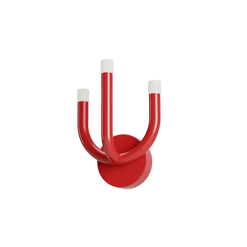 Lampada da parete LED con struttura a 3 bracci realizzata in alluminio e metallo verniciato rosso lucido. I diffusori sono in acrilico satinato.