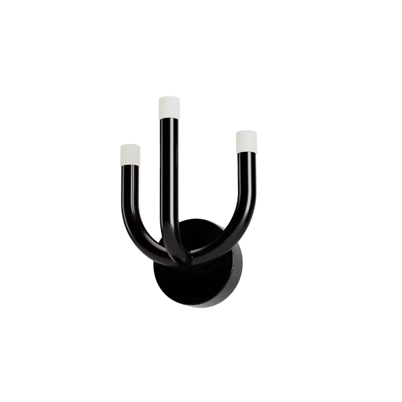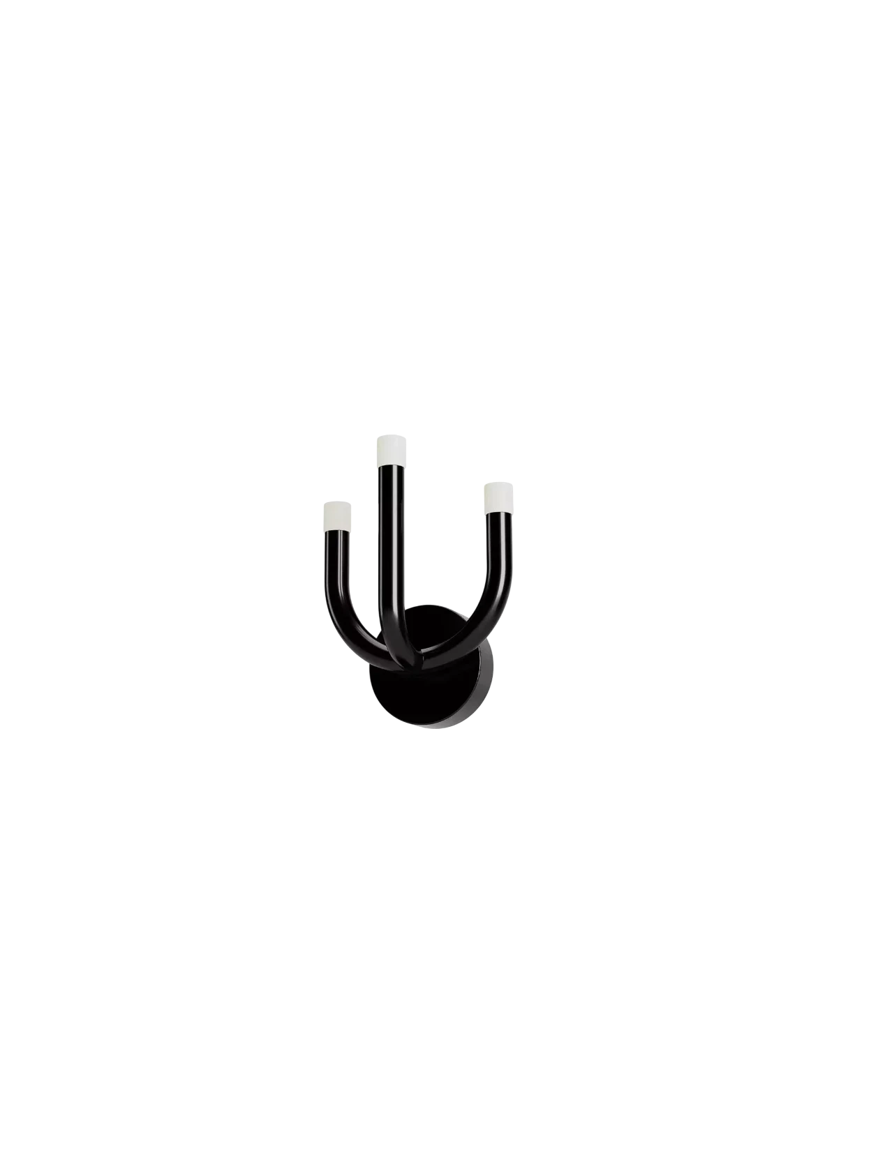 Lampada da parete LED con struttura a 3 bracci realizzata in alluminio e metallo verniciato nero lucido. I diffusori sono in acrilico satinato.