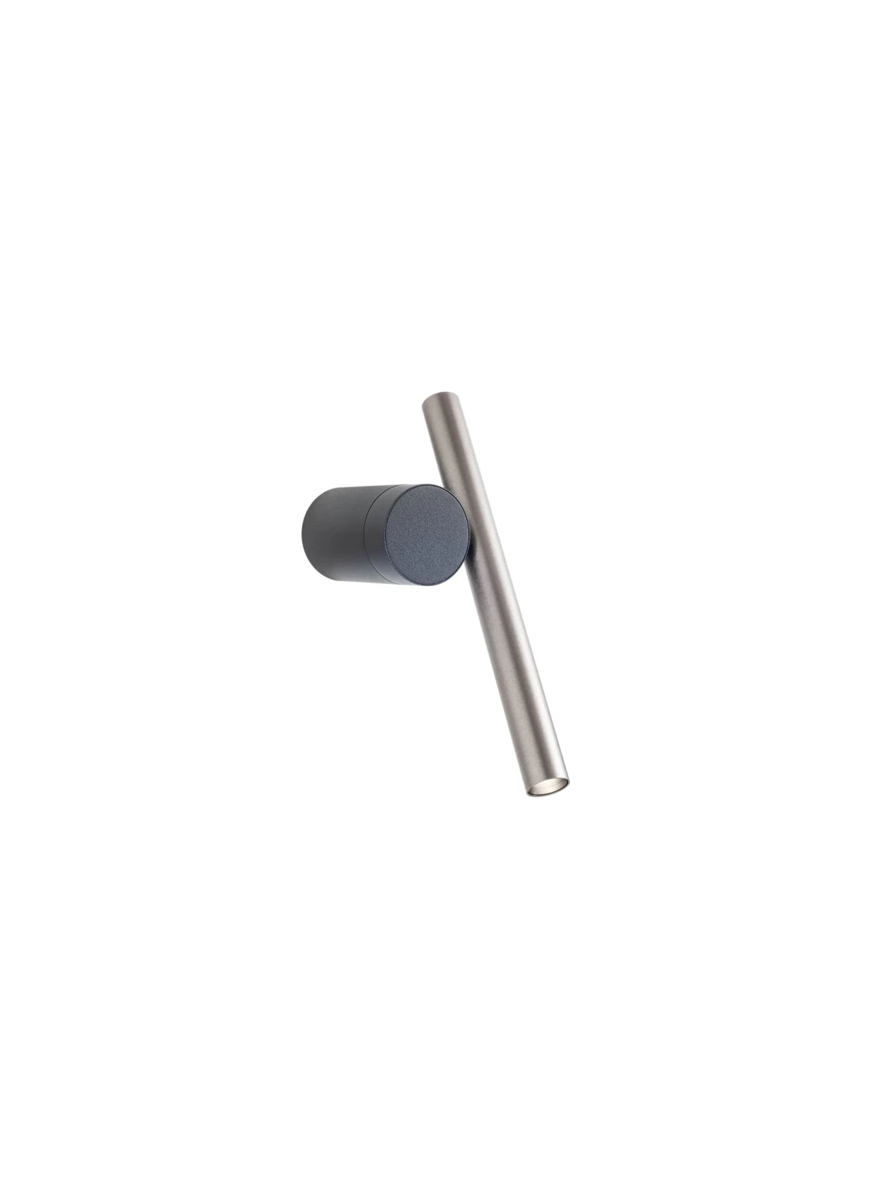 Lampada da parete orientabile dotata di LED COB. La struttura è in alluminio estruso e metallo verniciata nero opaco, con testa dello spot verniciata silver coffee e diffusore in policarbonato trasparente.
