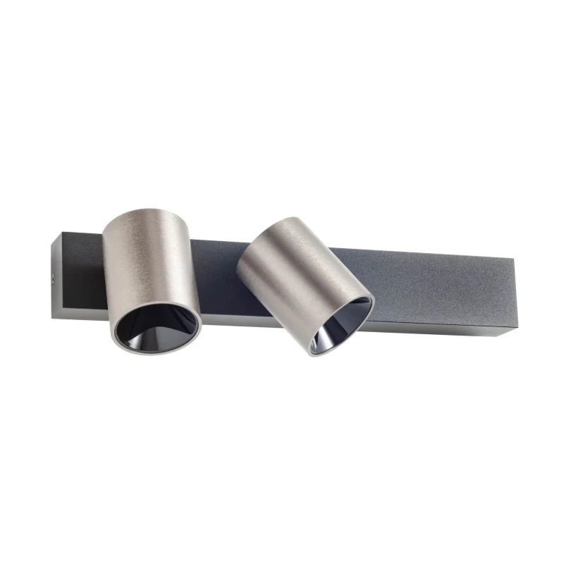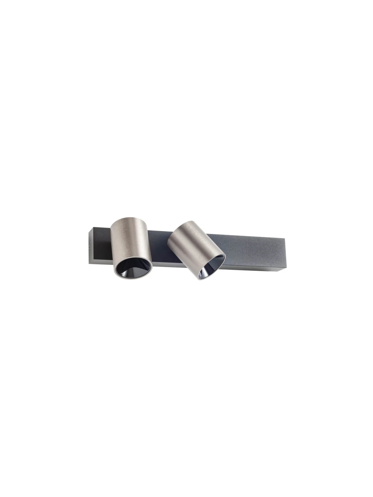 Lampada da parete per interni dotata di due spot orientabili. La struttura è in estruso di alluminio verniciato nero opaco con due spot in finitura foggy nickel e diffusori in policarbonato satinato.