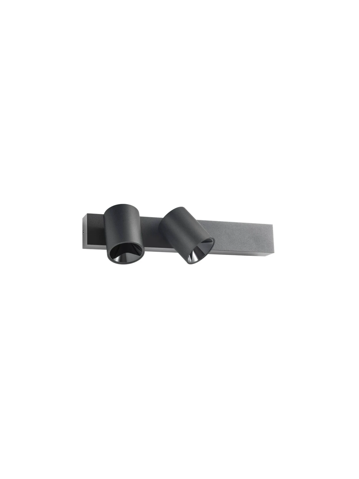 Lampada da parete per interni dotata di due spot orientabili. La struttura è in estruso di alluminio verniciato nero opaco e diffusori in policarbonato satinato.