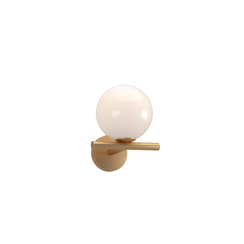 Lampada da parete con struttura in metallo in finitura bronzo spazzolato e diffusore sferico in vetro soffiato bianco opale.