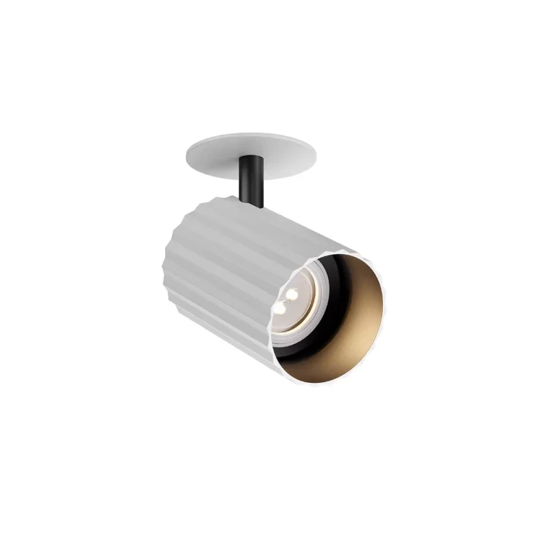 Miniproiettore orientabile a semincasso realizzato in alluminio estruso verniciato esternamente a polveri bianche, nere o oro opaco, ed internamente in nero opaco.