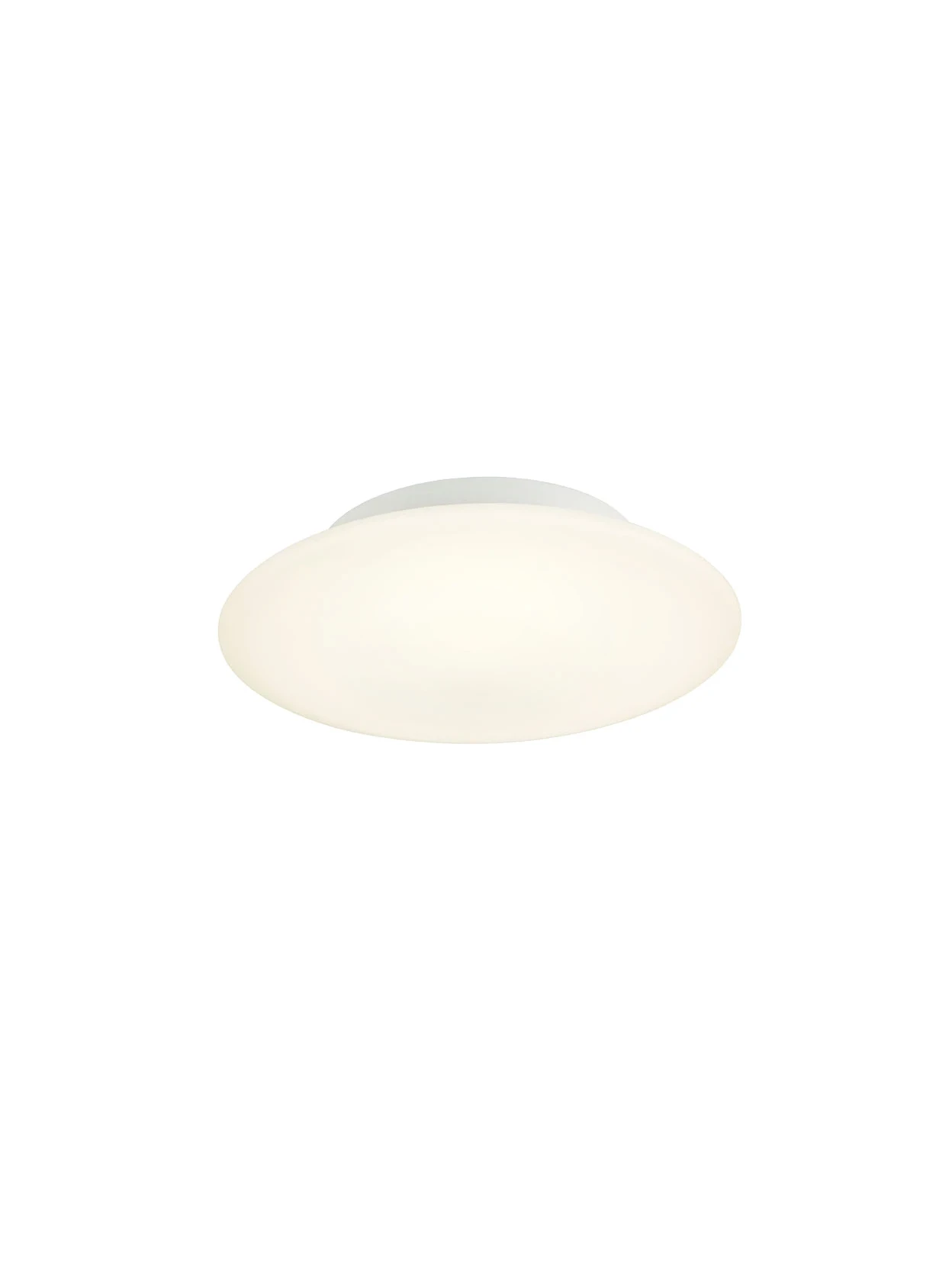 Lampada da soffitto LED per interni con protezione contro l’umidità. Struttura in metallo verniciato bianco e diffusore in vetro soffiato bianco opale.