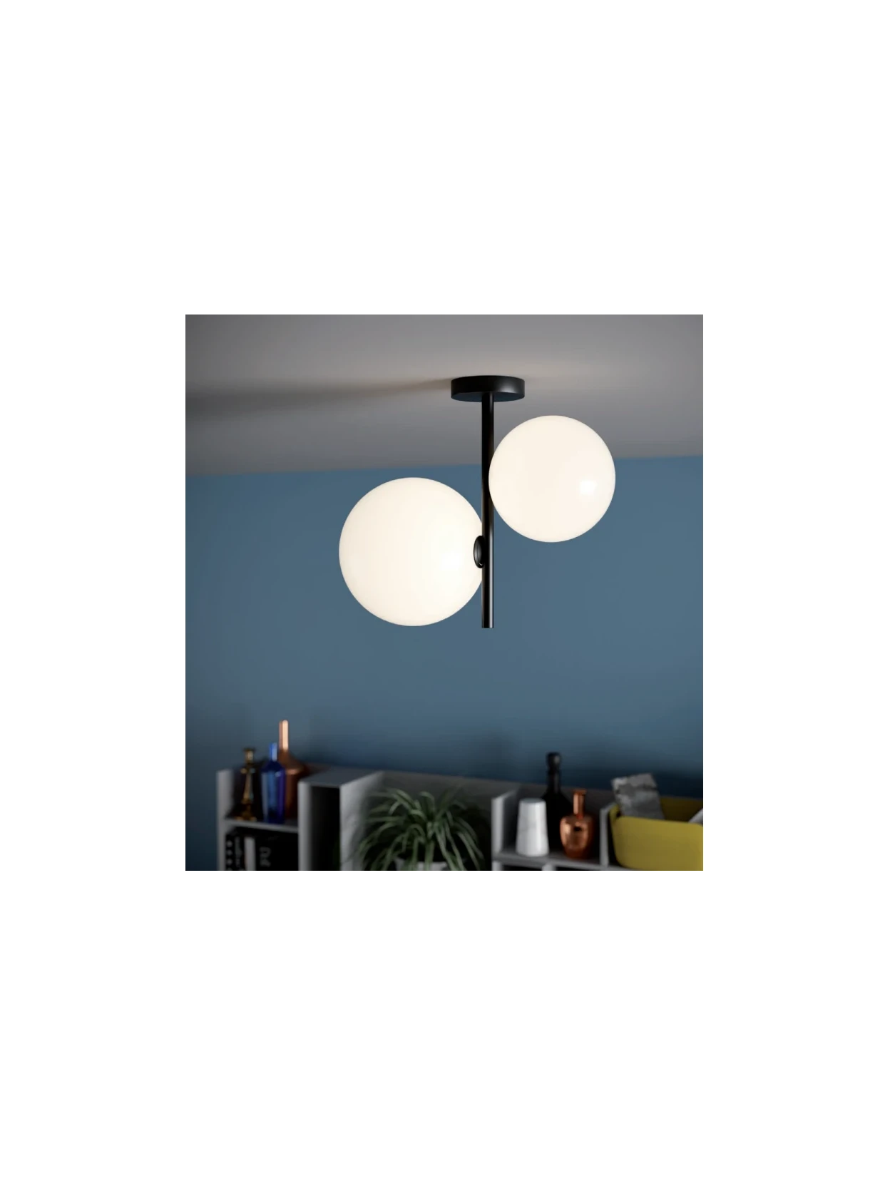 Lampada da soffitto con struttura in metallo in finitura bronzo spazzolato e diffusori sferici in vetro soffiato bianco opale.