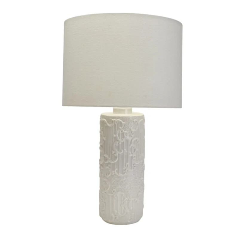 Elegante lampada da tavolo della collezione Dentelle firmata Henriette. Con base in porcellana bianca con decori in rilievo tono su tono e paralume in tessuto bianco, dona un tocco raffinato e luminoso a ogni ambiente.