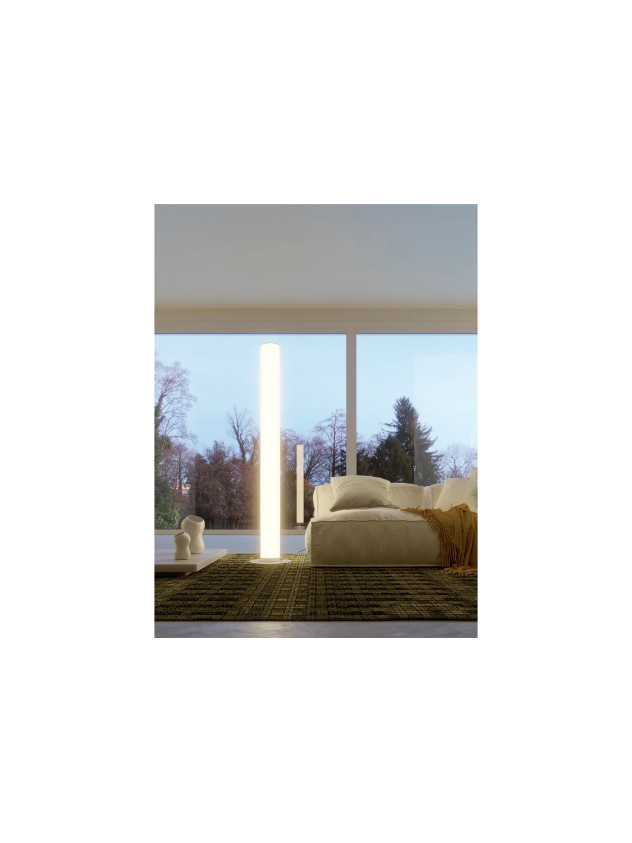 Lampada da terra LED con struttura in metallo verniciato bianco opaco e diffusore in acrilico bianco satinato.