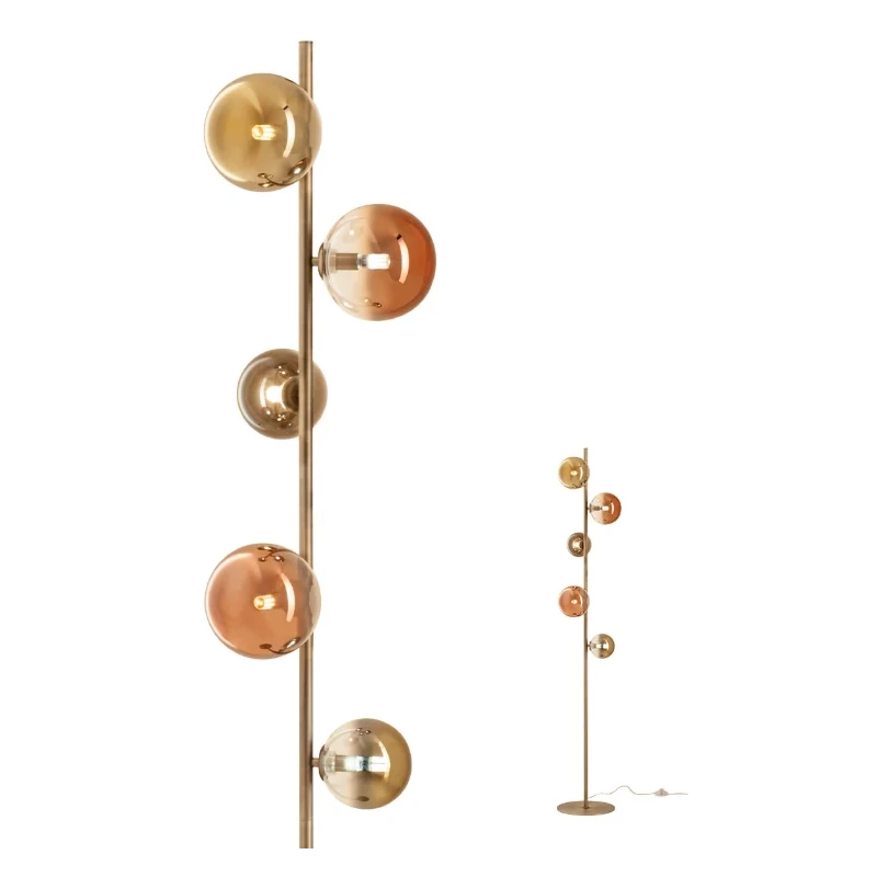 Roy di Redo Group è una lampada da terra per interni dal design elegante e sofisticato, ideale per illuminare con stile zone living o angoli lettura. La struttura in metallo con finitura ottone anticato opaco si abbina armoniosamente ai diffusori in vetro pyrex sfumato a specchio oro e caffè, creando un’atmosfera calda e avvolgente. Equipaggiata con 5 attacchi G9 per lampadine da max 10W, funziona a 220–240V (50/60Hz). Classe di protezione II, grado IP20.