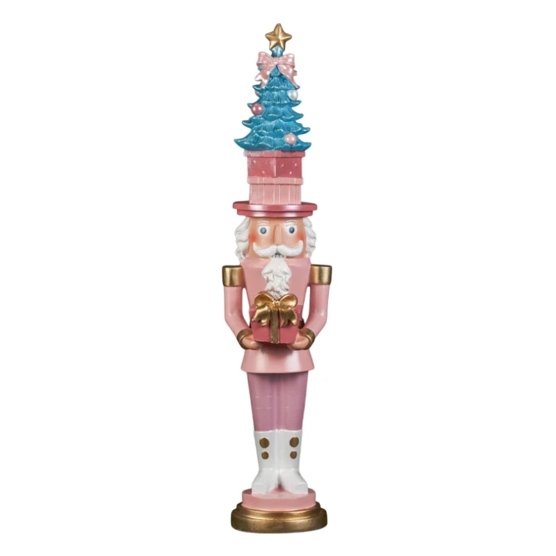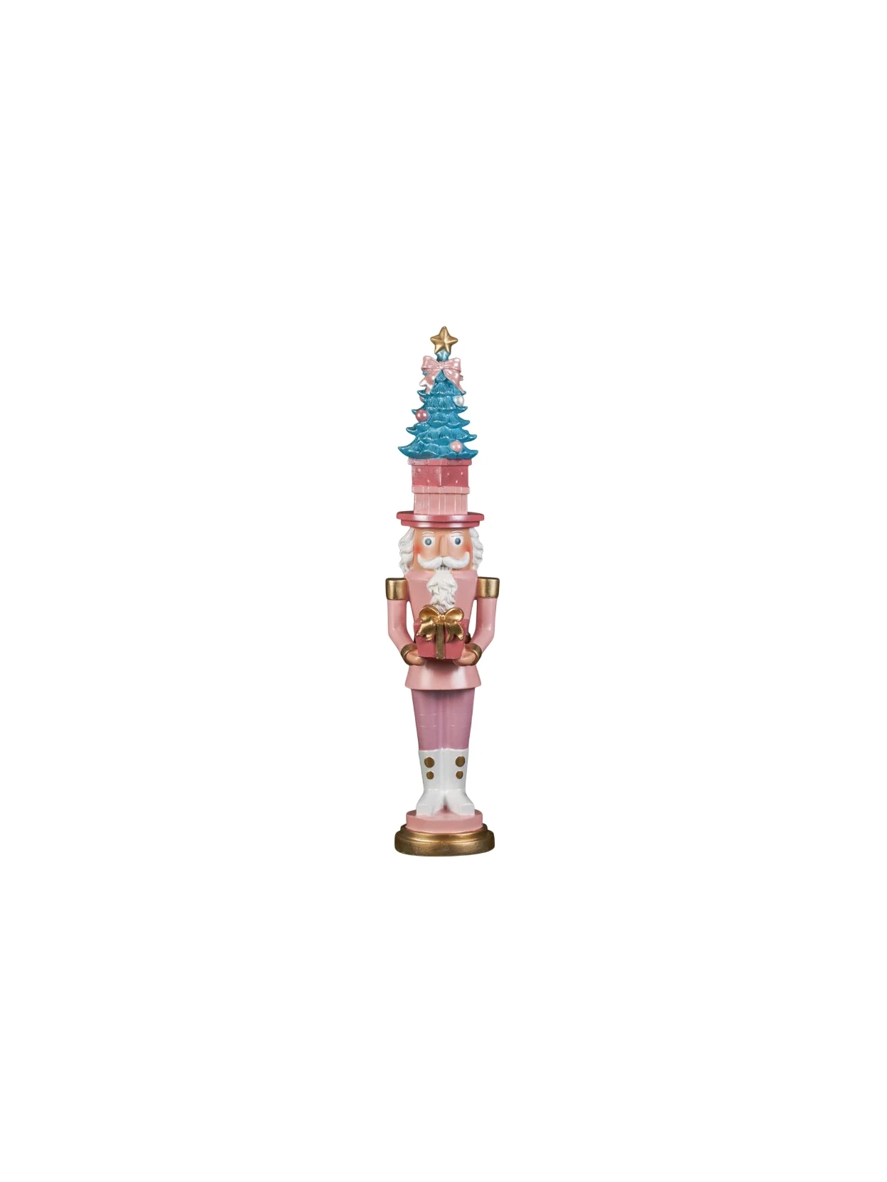 Schiaccianoci con albero di Natale Henriette H 51 cm in resina rosa dipinta a mano. Un’elegante decorazione natalizia ricca di fascino, perfetta per creare un’atmosfera magica e raffinata.