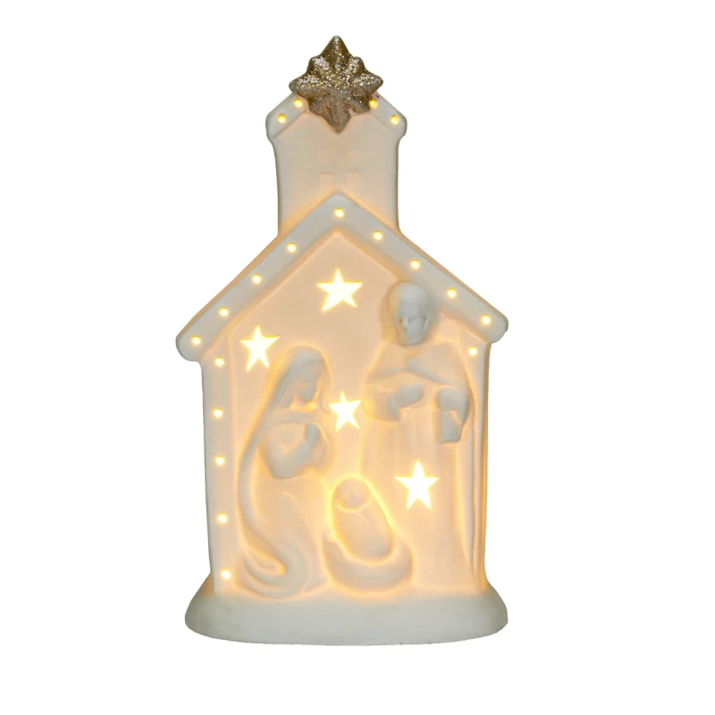 Raffinata Natività di Henriette in ceramica bianco opaco con luce LED. La Sacra Famiglia è custodita in una graziosa casetta sormontata da una stella oro glitter, per un tocco elegante e luminoso alle tue decorazioni natalizie.