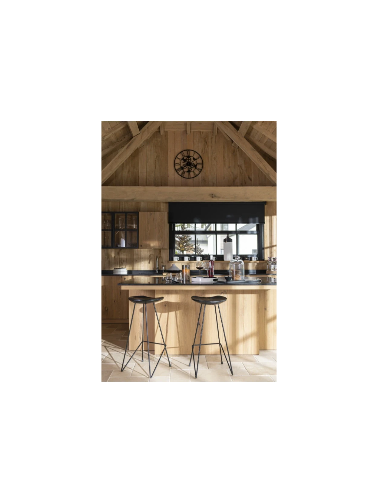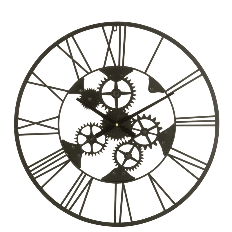 Orologio da parete rotondo dal diametro di 60 cm, dallo stile industriale. Realizzato in metallo nero, combina eleganza e robustezza. Il suo punto di forza è il quadrante, impreziosito al centro da ingranaggi decorativi che ne esaltano il design unico.