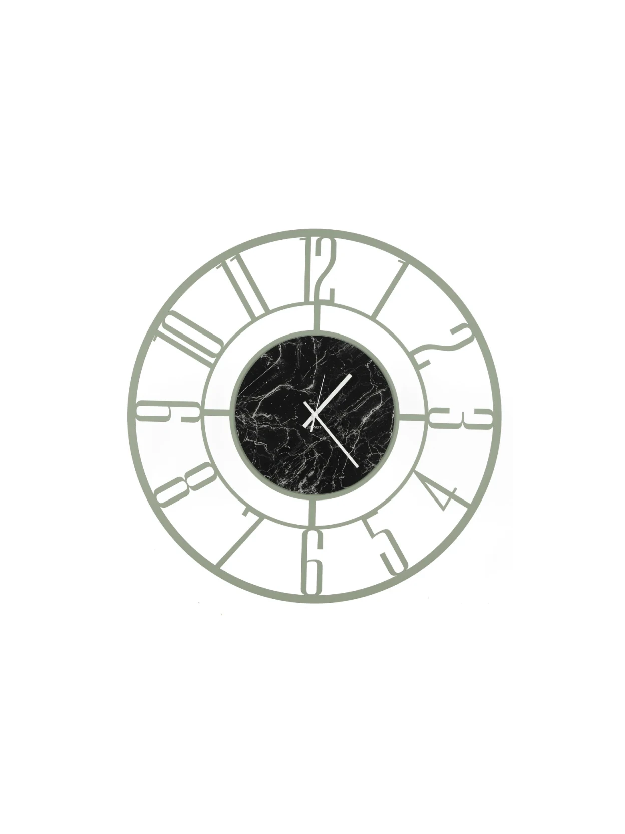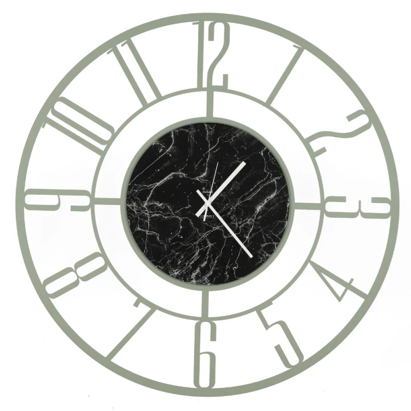 Orologio da parete Penelope di Ceart in metallo Verde Salvia con quadrante in vetro marmorizzato nero. Design moderno e raffinato, disponibile Ø 50 e 80 cm. Made in Italy.