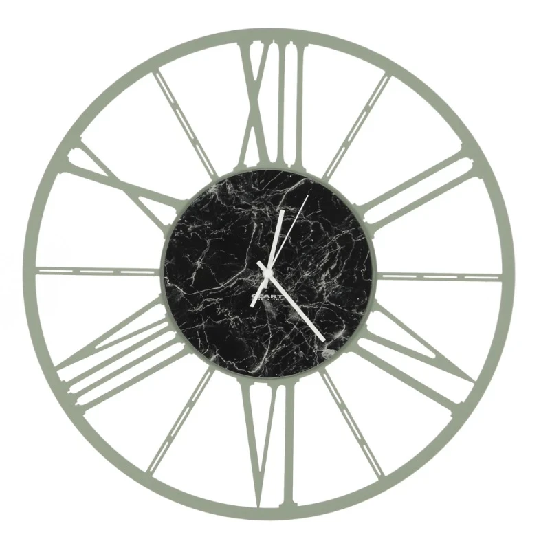 Ruota è un orologio da parete moderno con numeri romani e quadrante in vetro marmorizzato. Finitura tortora pastello, eleganza contemporanea e qualità artigianale made in Italy firmata Ceart. Disponibile nei diametri 50 cm e 80 cm.