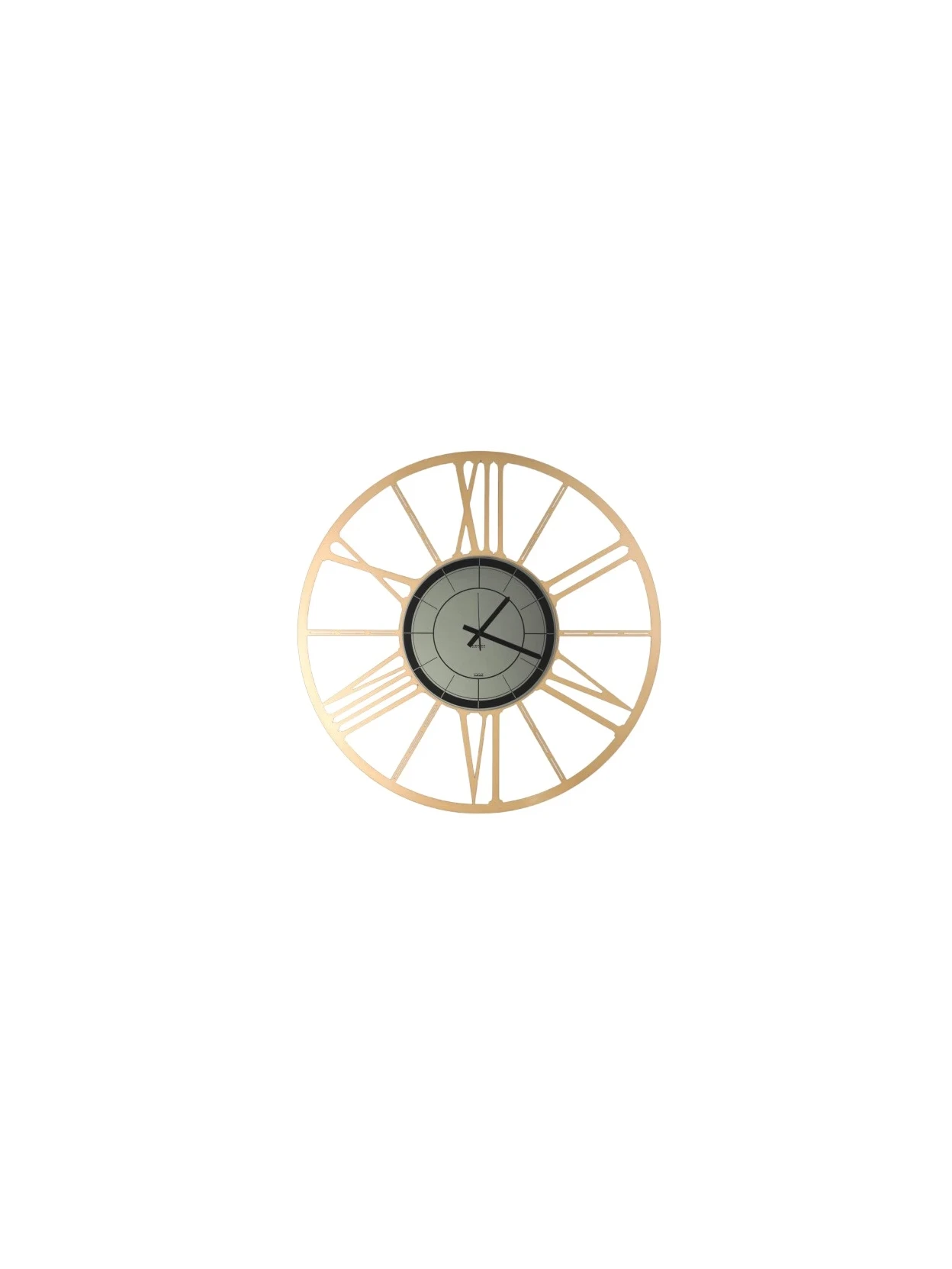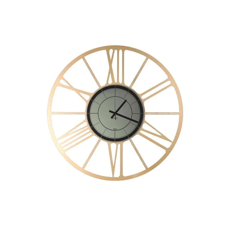 Ruota black edition è un orologio da parete moderno in metallo oro metallizzato con quadrante in vetro specchiato nero fumé. Numeri romani eleganti, design contemporaneo e qualità artigianale italiana. Disponibile nei diametri 50 cm, 80 cm e 100 cm.