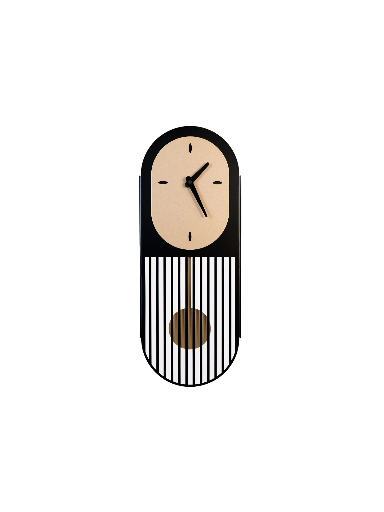 Pendolino è un orologio da parete con movimento a pendolo, realizzato in metallo nei toni nero e oro metallizzato. Design moderno e artigianalità Made in Italy.