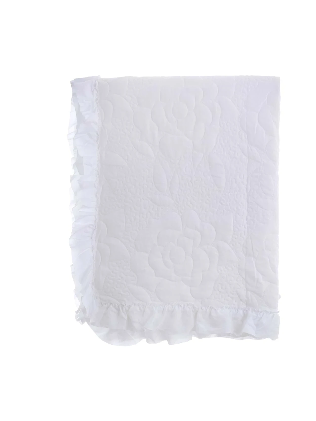 Trapunta con gala di Blanc Mariclò della Collezione Camelia. Elegante e romantica, in soffice poliestere bianco con camelie in rilievo tono su tono, perfetta per uno stile shabby chic raffinato.