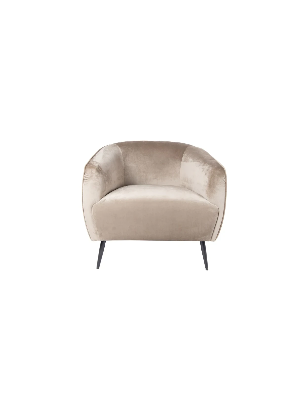 Poltrona Vinn di PTMD in tessuto effetto velluto color tortora con gambe in metallo nero. Elegante e confortevole, ideale per dare un tocco di lusso a ogni ambiente.