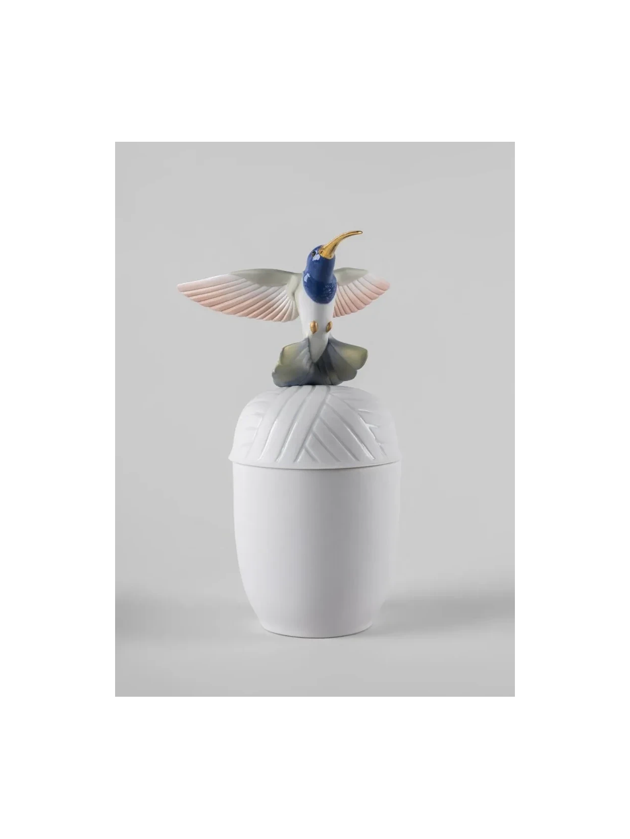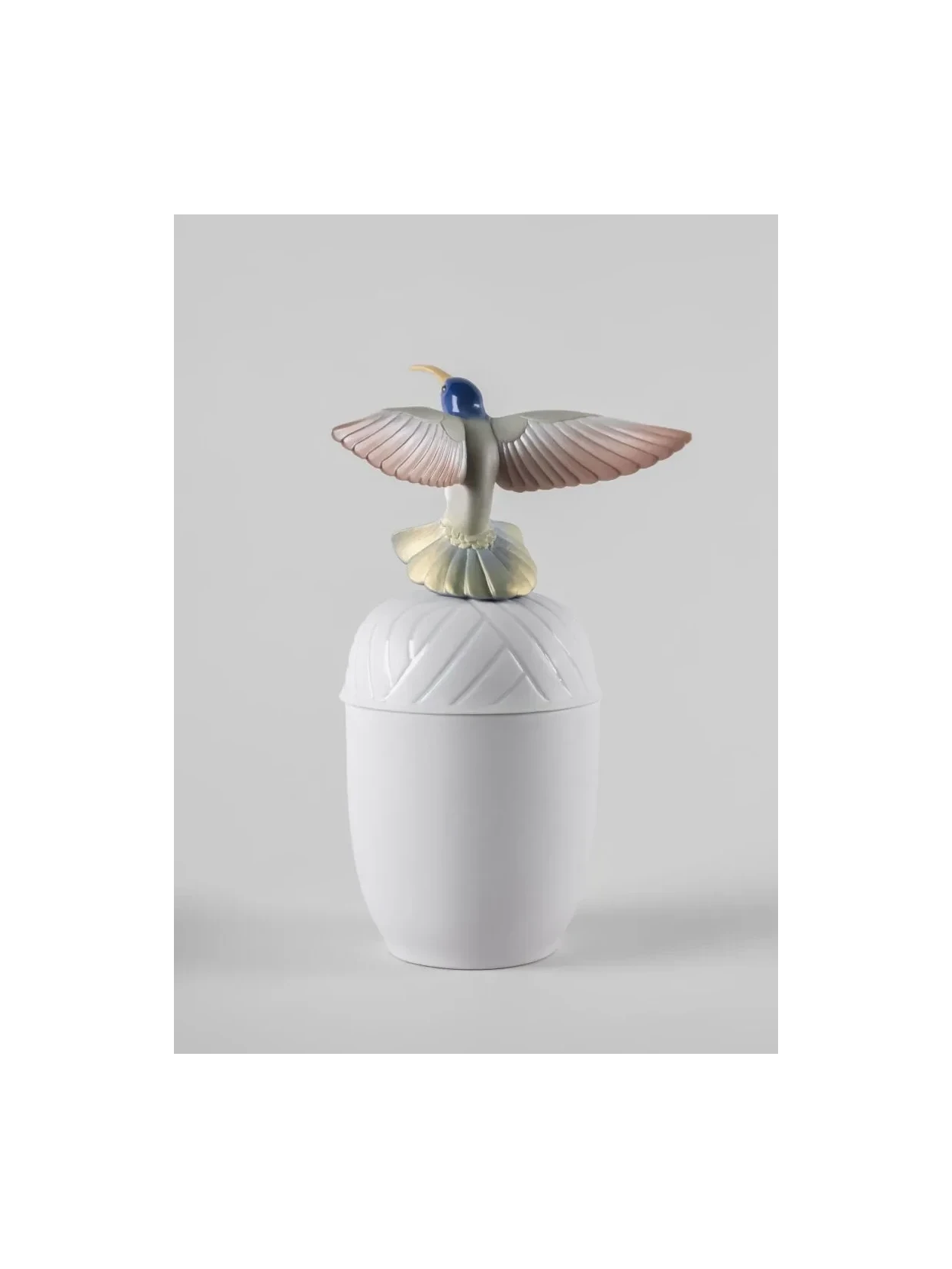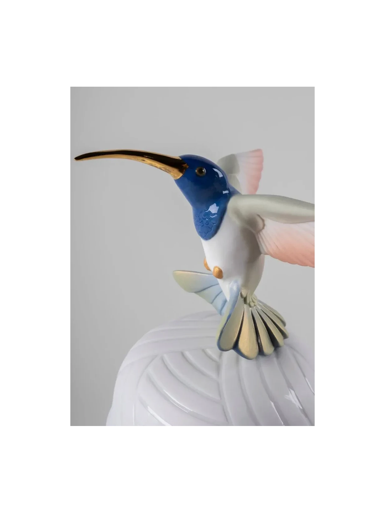 Scrigno Colibrì firmato Lladró è un contenitore elegante realizzato in porcellana con superfici opache e dettagli lucidi, arricchito da un colibrì dai colori metallici e iridescenti. Un pezzo raffinato che unisce funzionalità, arte e vivacità cromatica.