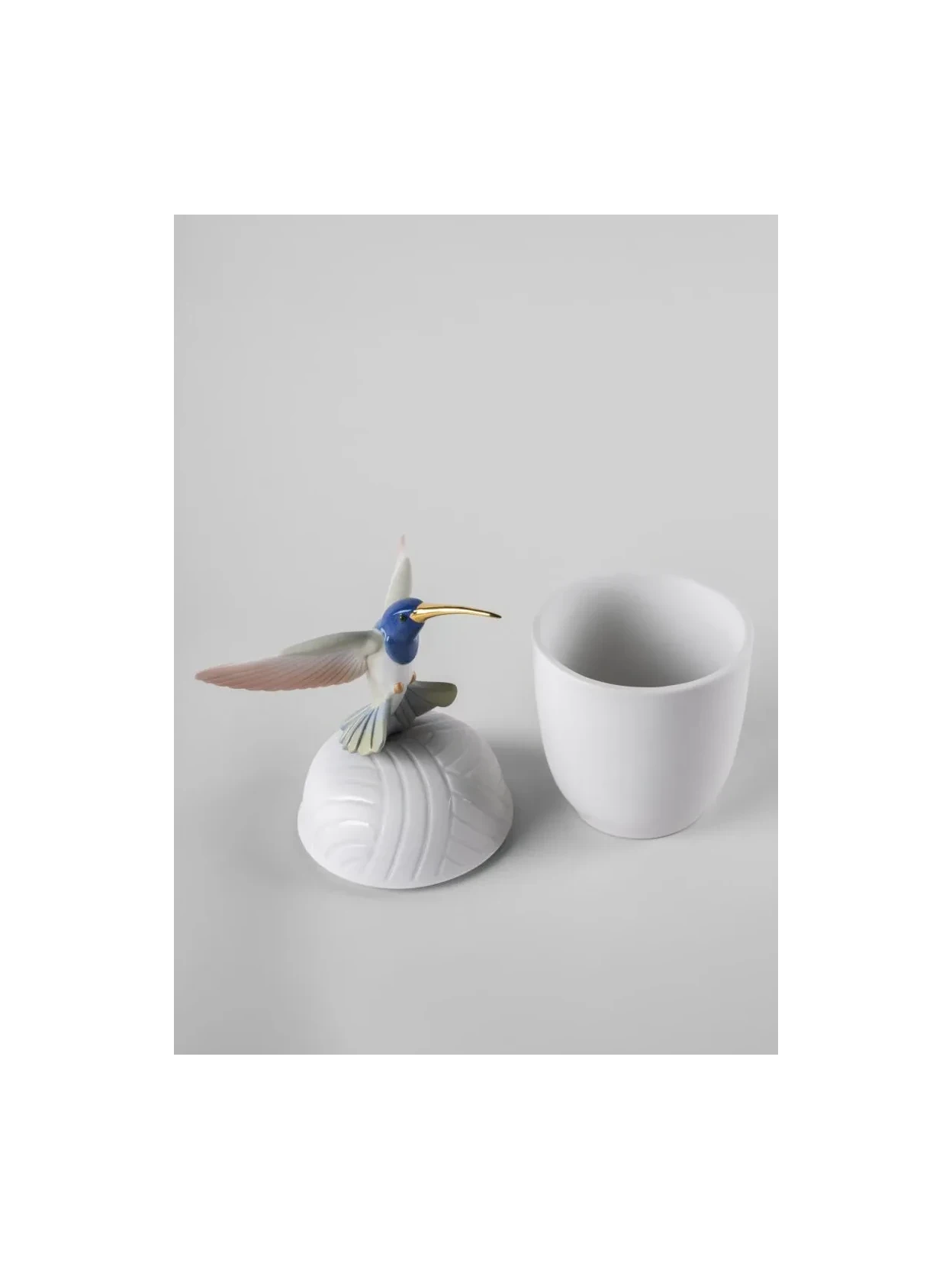 Lo scrigno colibrì è un oggetto funzionale che diventa opera d’arte, grazie alla combinazione tra porcellana finemente lavorata e la presenza di un colibrì riccamente decorato. Il contenitore, caratterizzato da una finitura mate satin con dettagli lucidi che valorizzano l’incisione dei coperchi, crea un elegante contrasto con la vivacità dell’uccellino, dipinto con tonalità brillanti, pigmenti metallici e iridescenti in una gamma di colori ricca e luminosa.
