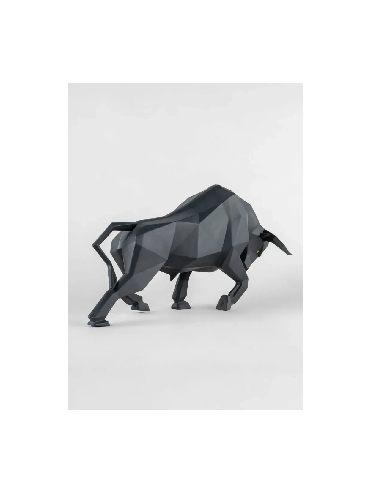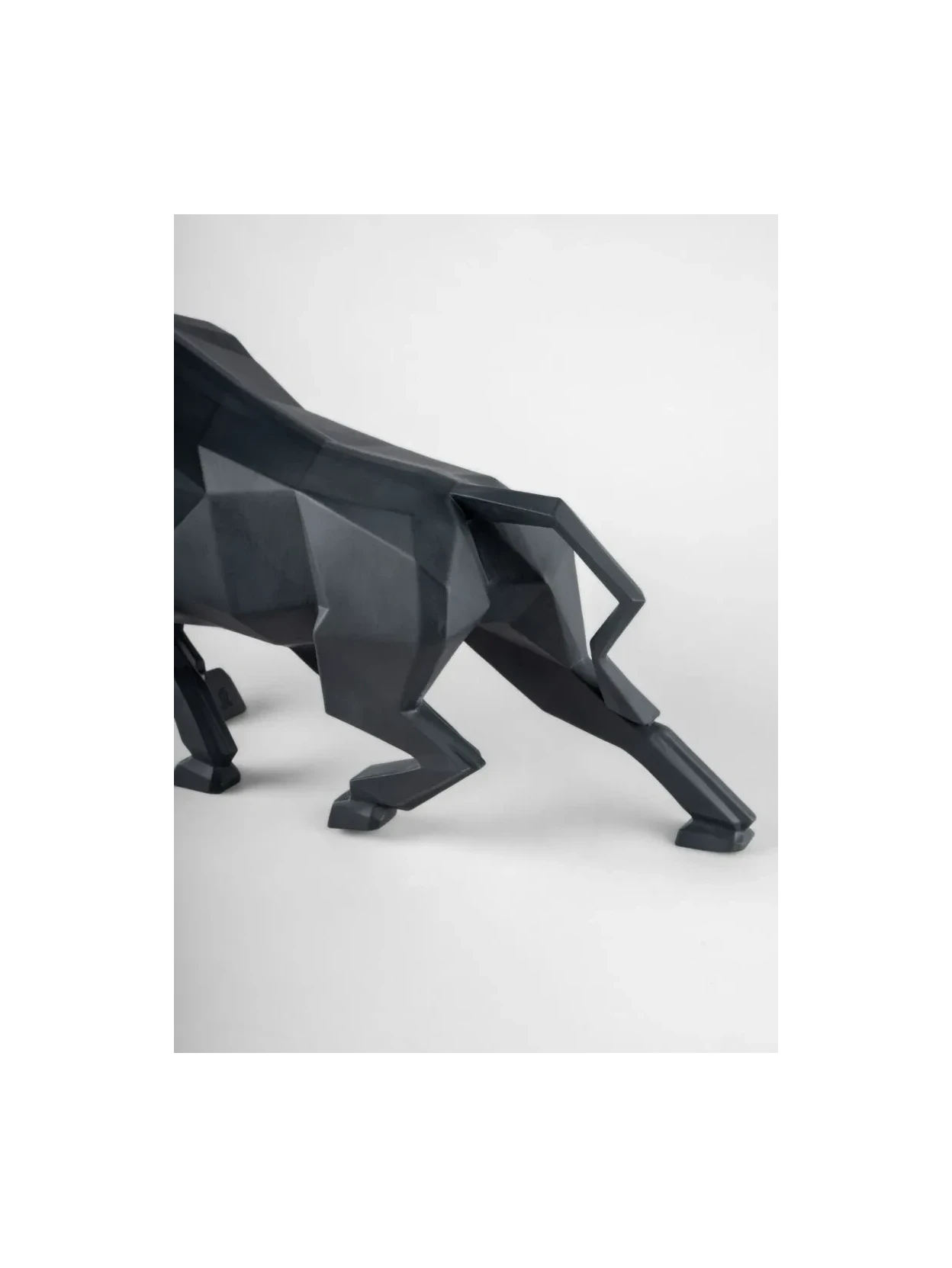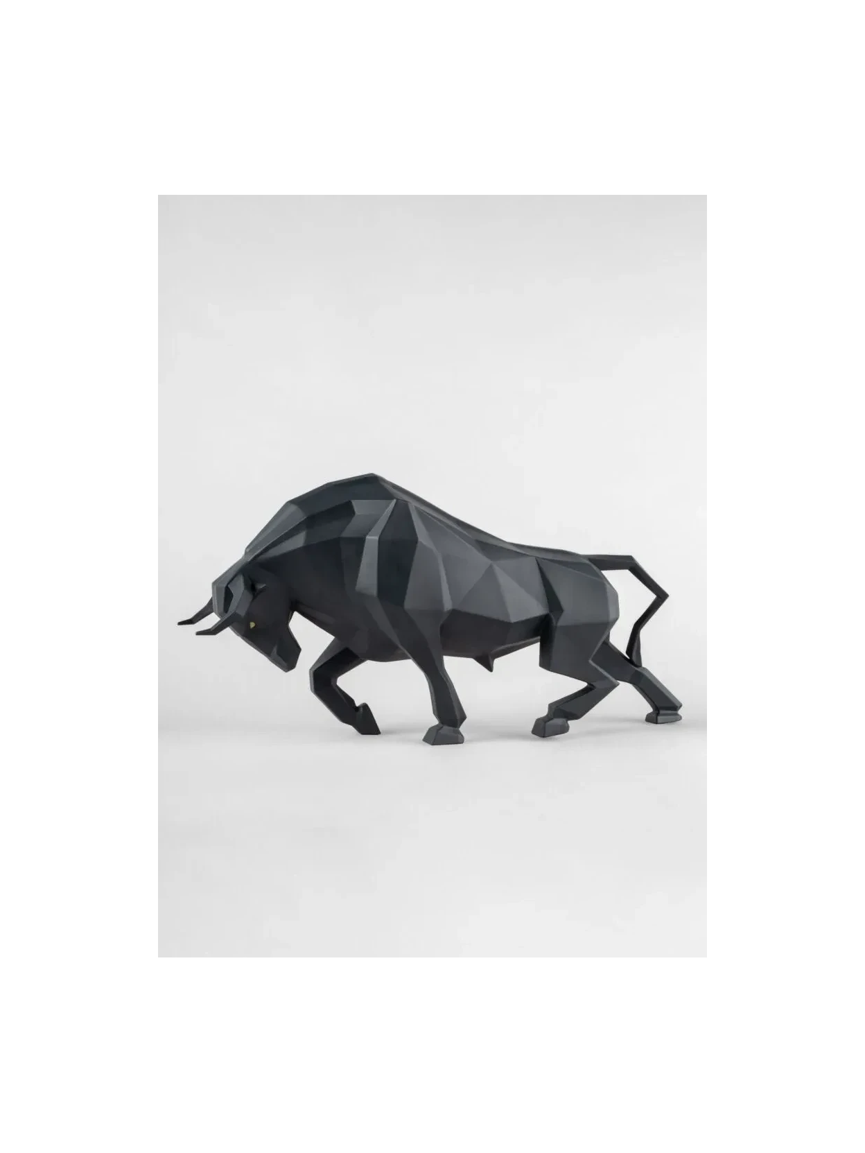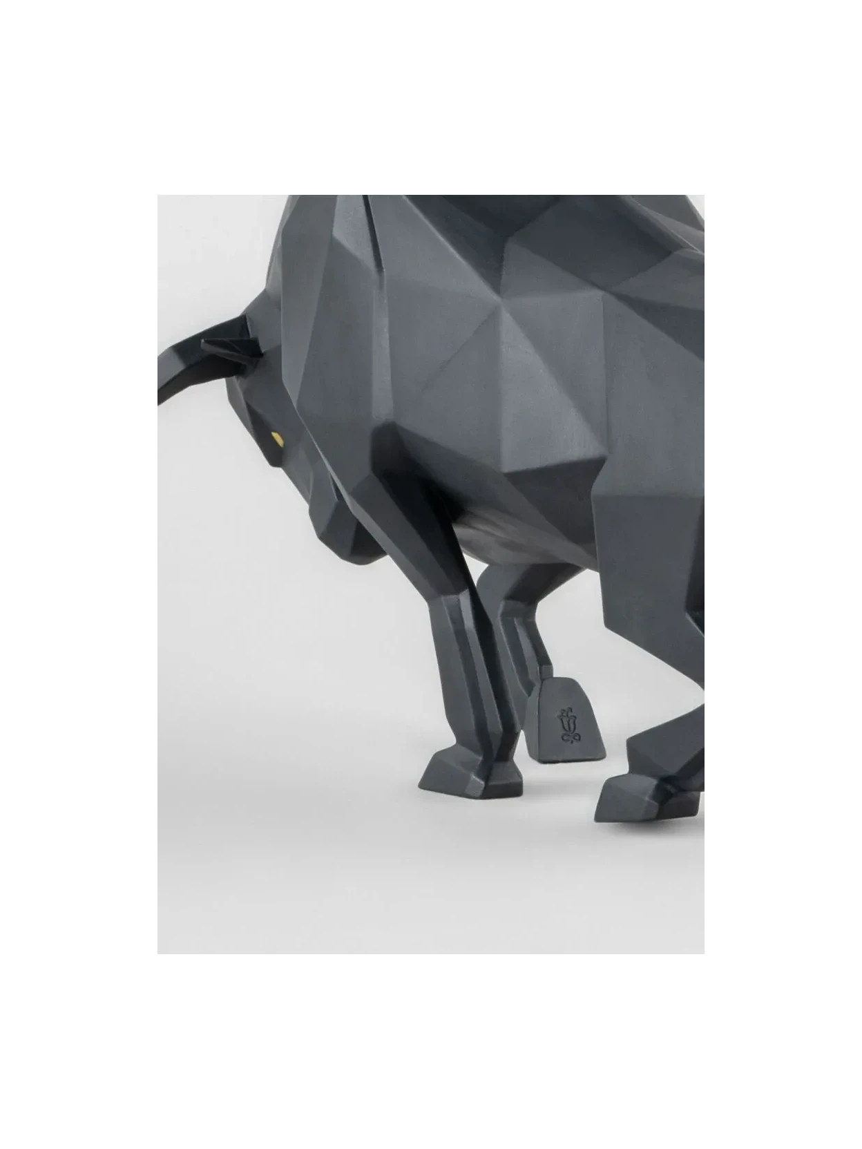 Scultura in porcellana nera opaca raffigurante un toro in posizione da carica. Un pezzo unico della collezione Origami che unisce forza, geometria e design contemporaneo.