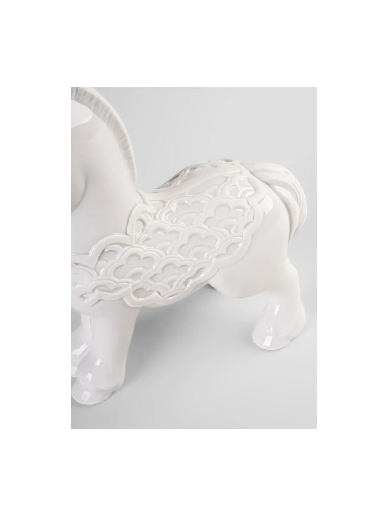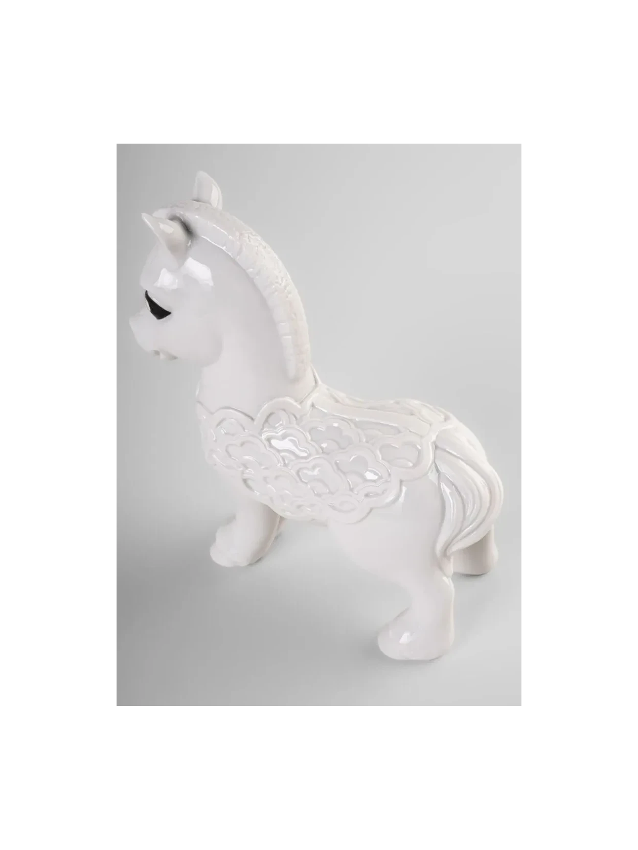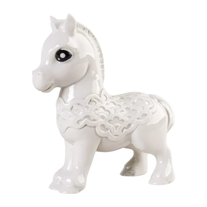 Baby Horse, parte della collezione Baby Animals di Lladró, reinterpreta con ironia e dolcezza uno dei dodici animali dello zodiaco cinese. Questa figura in porcellana cattura il lato più amichevole e giocoso del cavallo, mantenendo al tempo stesso il suo profondo simbolismo: energia, libertà, dinamismo e spirito avventuriero. La finitura in porcellana bianca pura gioca su contrasti di superfici lucide e opache, creando movimento e ricchezza materica. La corazza decorativa, incisa a mano, e i grandi occhi neri donano al pezzo una straordinaria espressività, che rende ogni esemplare unico.