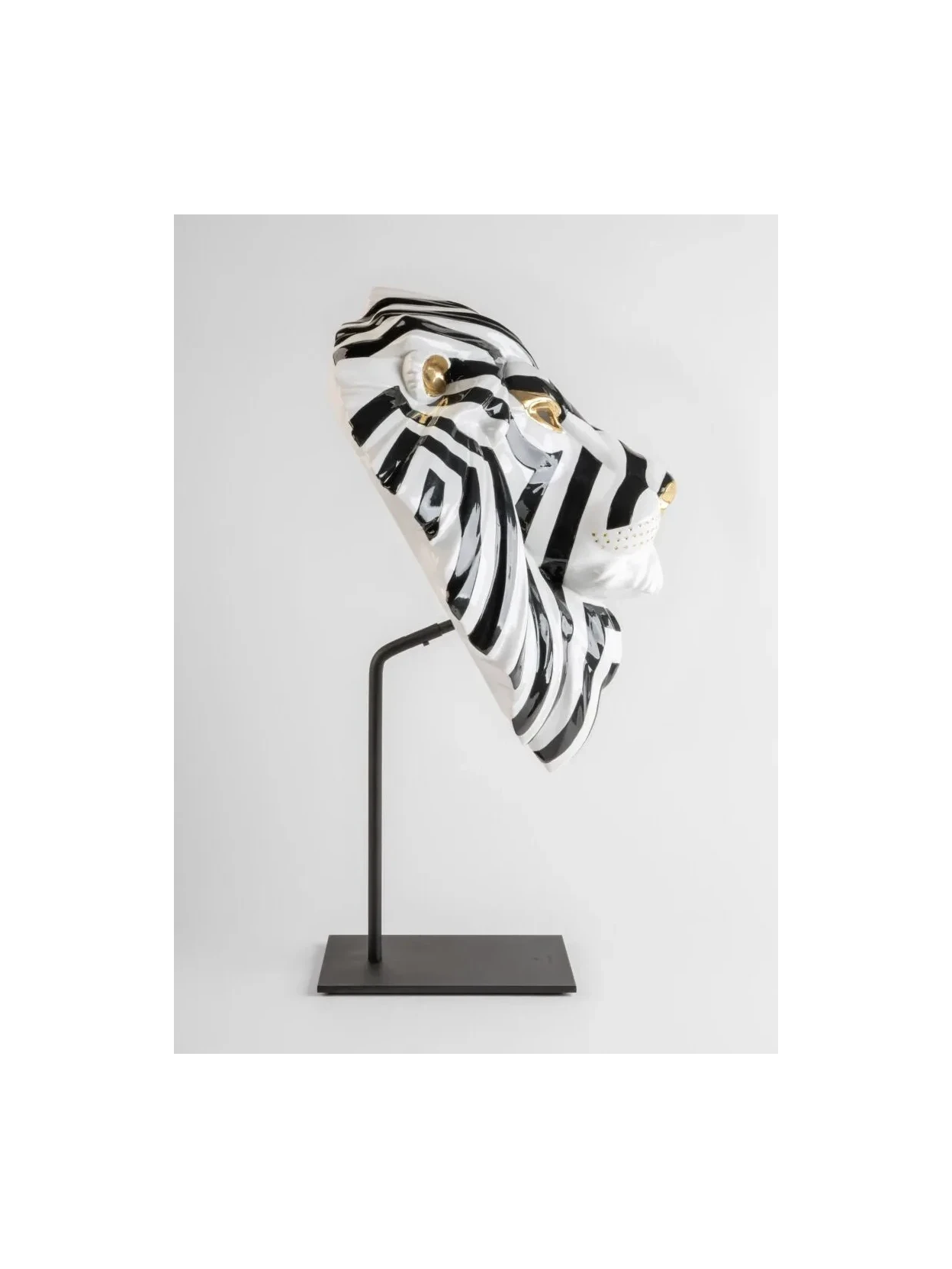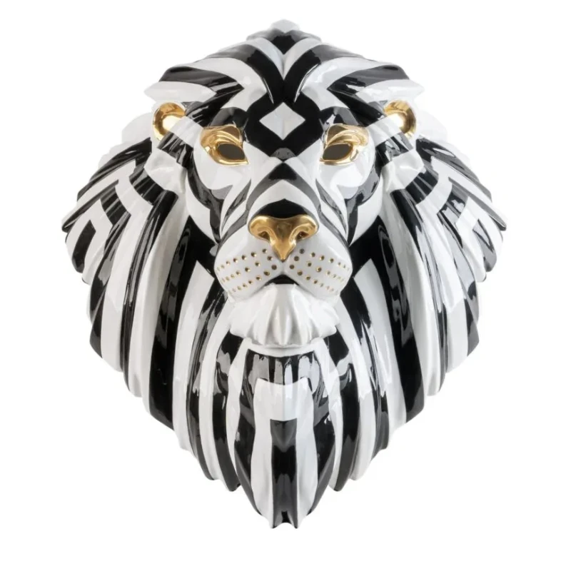 Maschera di Leone di Lladró è una scultura decorativa in porcellana con raffinata palette bianco, nero e oro. Un’opera potente ispirata alle maschere tribali africane, da esporre a parete o su supporto.