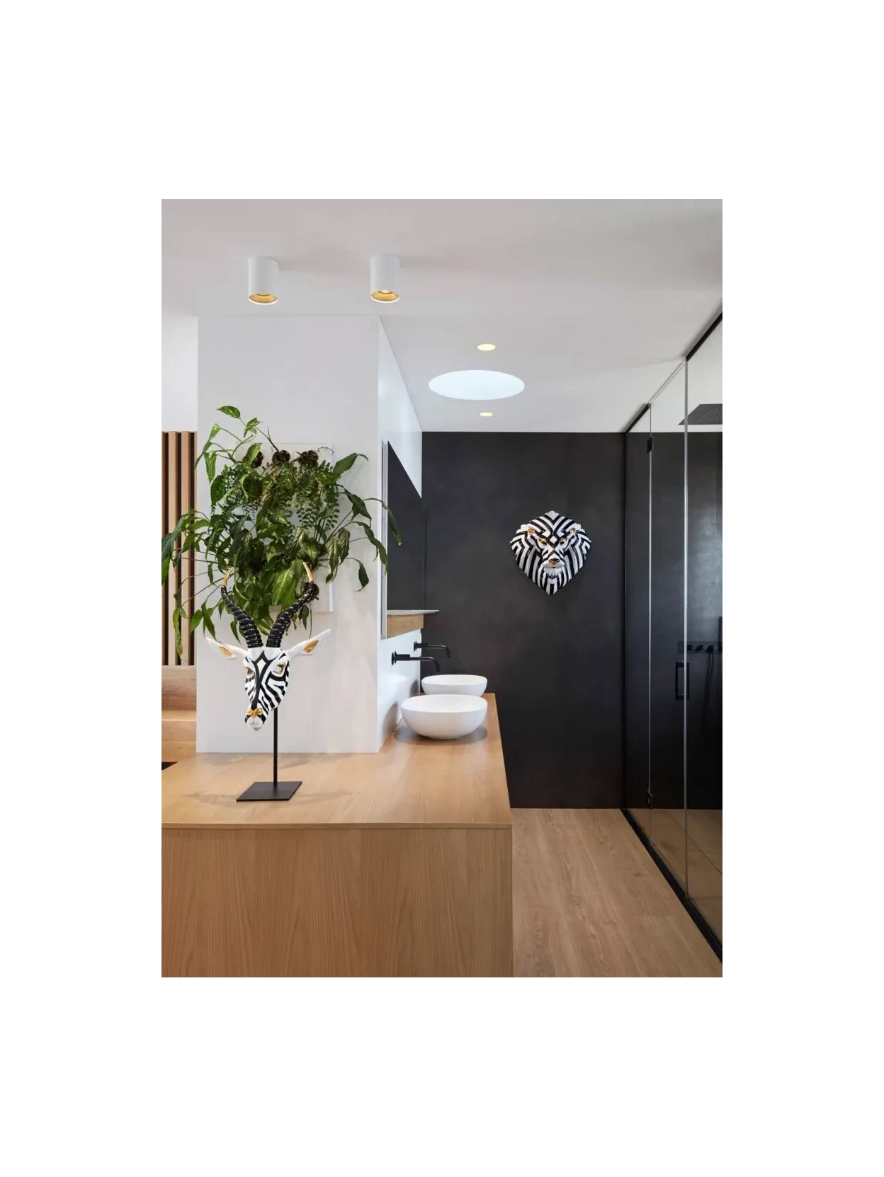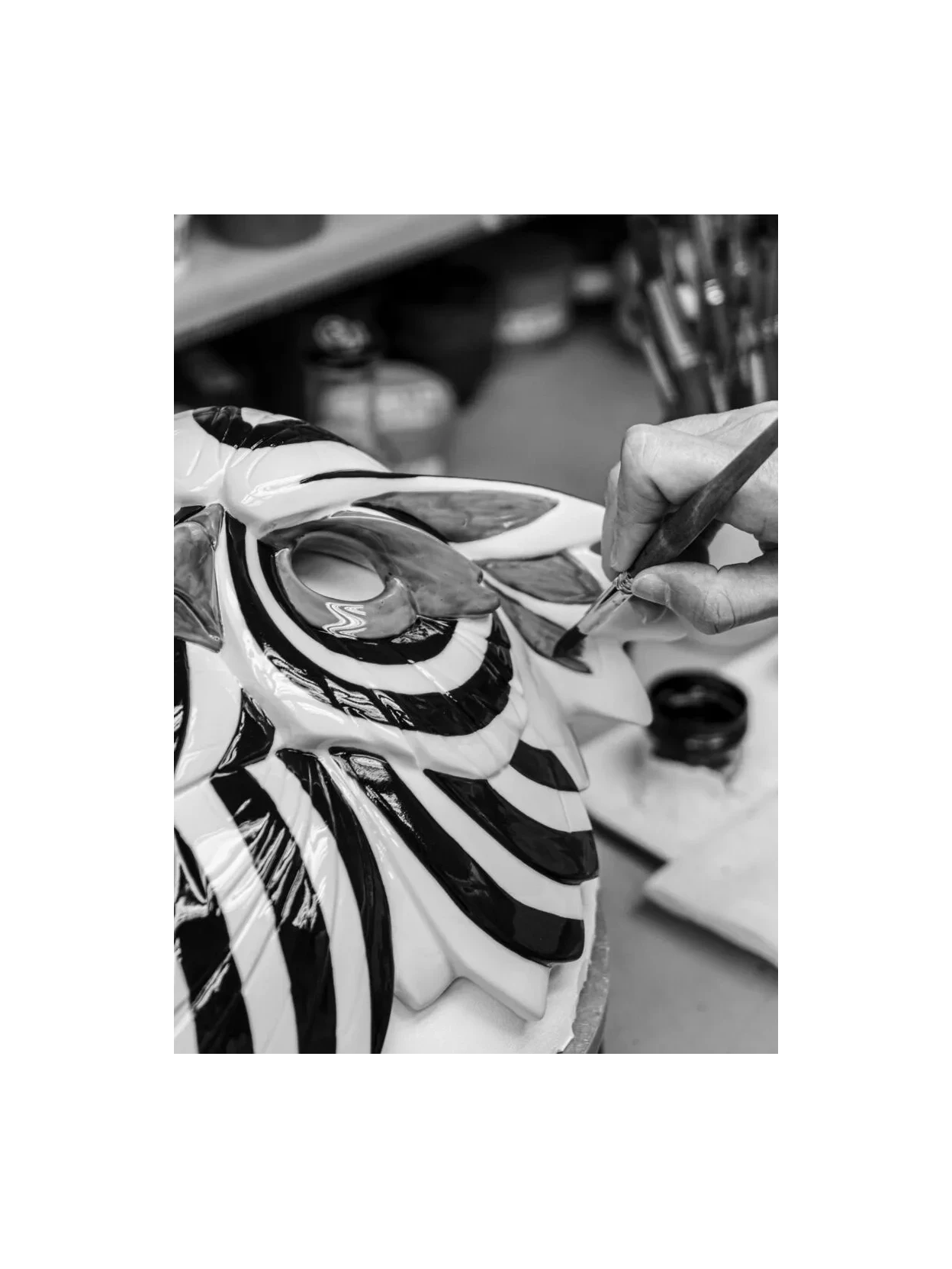 La Maschera di Leone arricchisce la collezione Fierce Portraits, una serie che reinterpreta l’arte delle maschere tribali africane attraverso l’eccellenza della porcellana Lladró. Il risultato è una creazione decorativa di grande presenza scenica, in cui il volto del leone viene modellato con straordinaria precisione e impreziosito dal contrasto elegante tra bianco, nero e dettagli in oro lucido. La finitura brillante e la cura dei volumi fanno risaltare la forza simbolica dell’animale, emblema di coraggio, regalità e protezione. Come tutti i pezzi della collezione, anche questa maschera è pensata per la massima versatilità d’esposizione: può essere collocata su un supporto da tavolo oppure appesa alla parete grazie all’apposito gancio integrato.