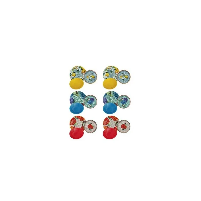 Servizio tavola Taormina di Henriette da 18 pezzi, composto da piatti piani, fondi e dessert con design floreale e colori brillanti. Perfetto per aggiungere un tocco di eleganza e vivacità alla tua tavola quotidiana o per cene speciali. Disponibile in tre combinazioni di colore: giallo, blu e rosso.
