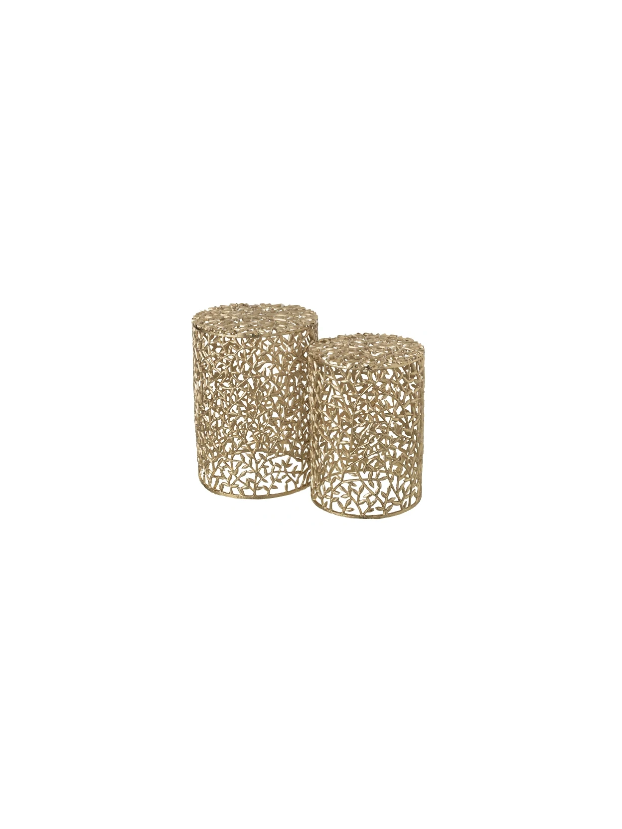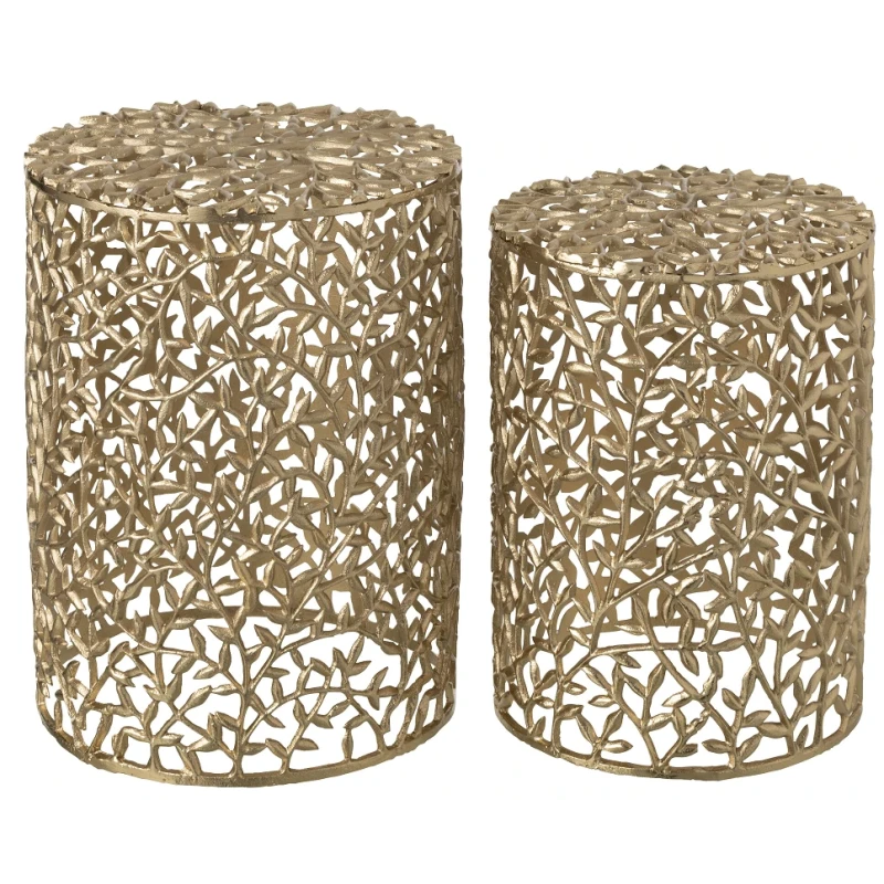 Set di 2 tavolini in alluminio color oro, eleganti e versatili. Ideali per arredare con stile salotti, terrazze o ambienti interni moderni.