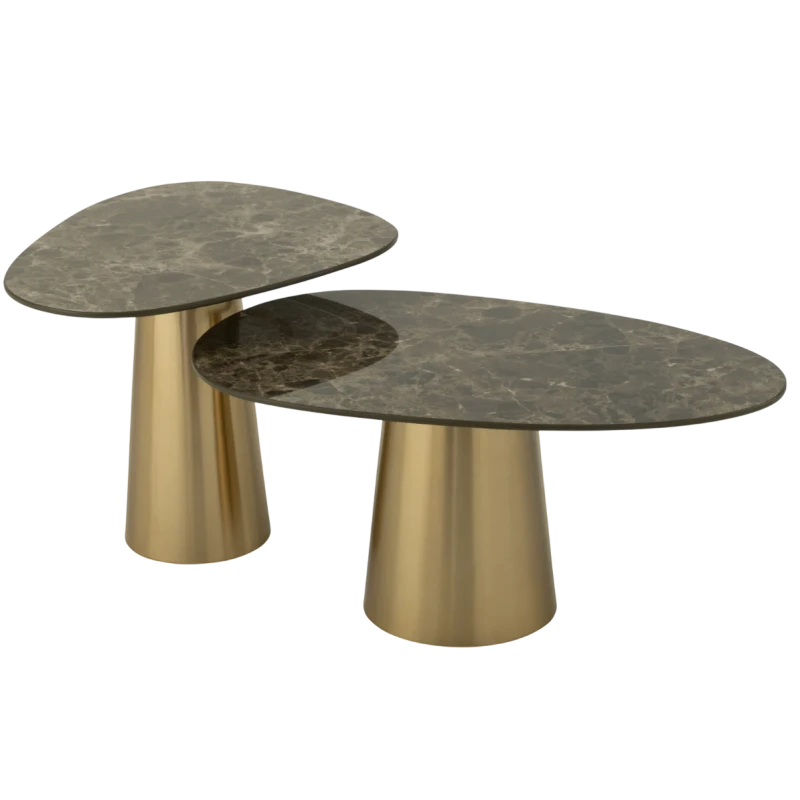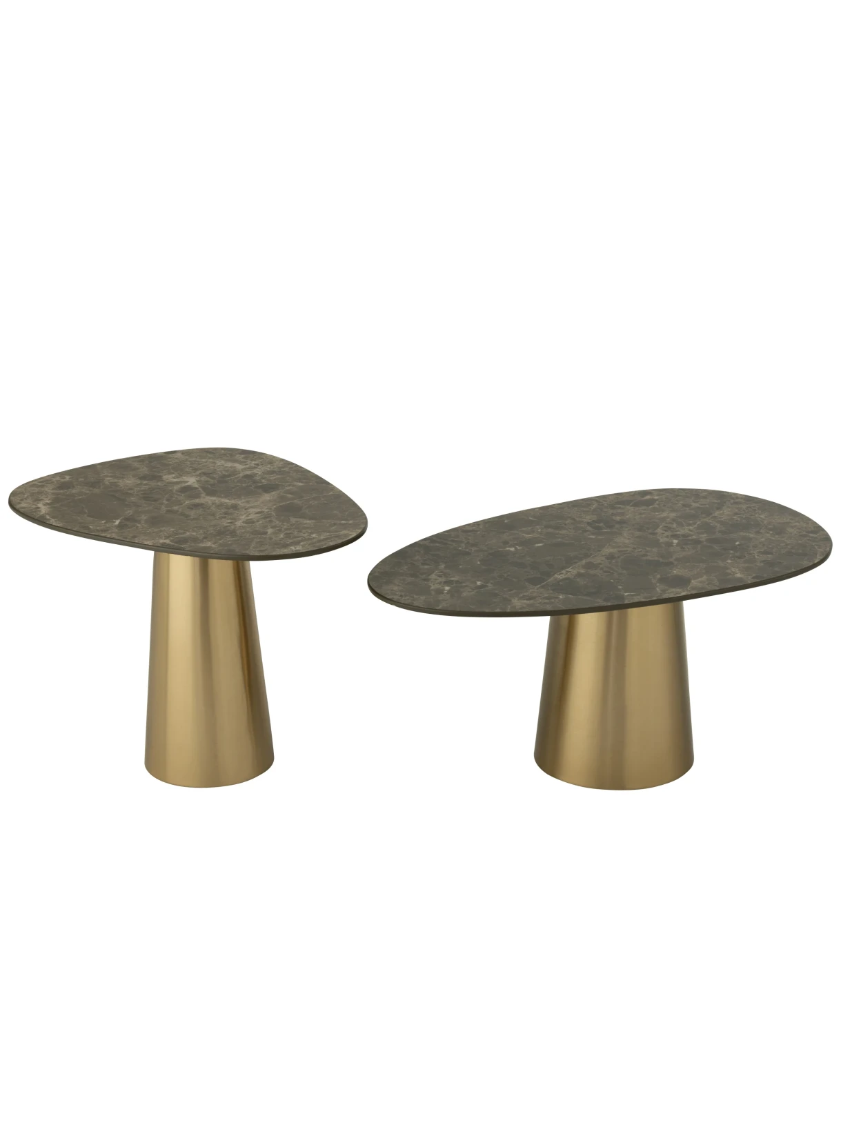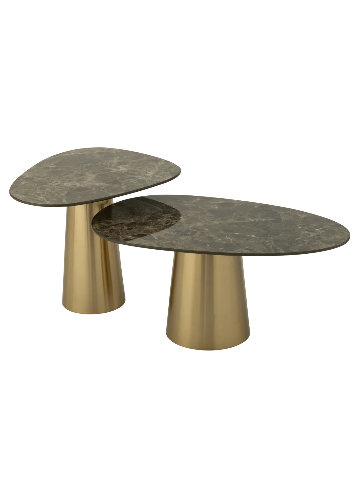 Tavolini dal design raffinato che uniscono stile e funzionalità. I piani dalla forma geometrica e irregolare e dall' effetto marmo regalano un look sofisticato, mentre le basi cilindriche in metallo bronzato aggiungono solidità e un tocco contemporaneo. Con altezze e diametri differenti possono essere disposti insieme per creare un gioco di volumi oppure essere usati separatamente.
