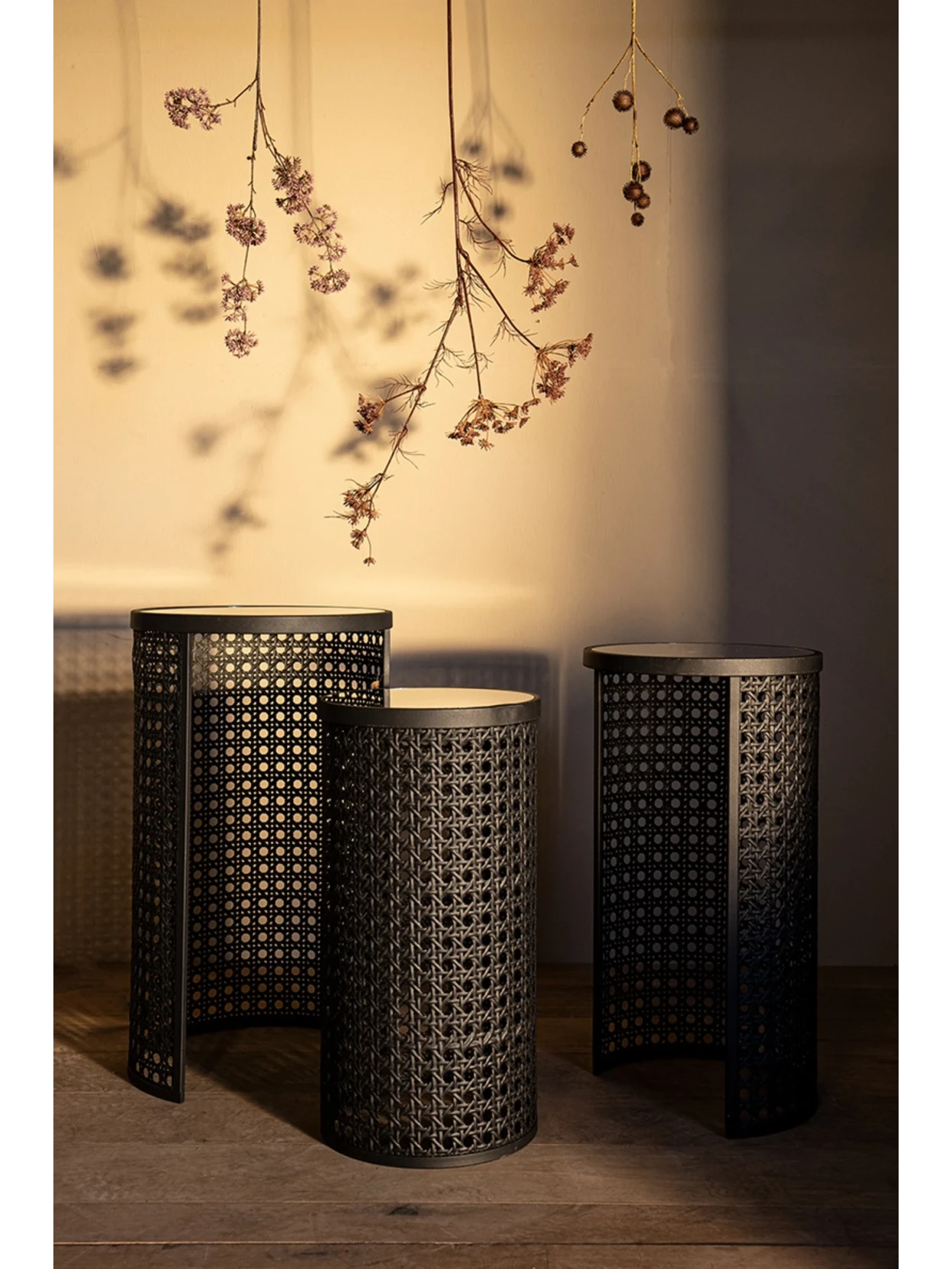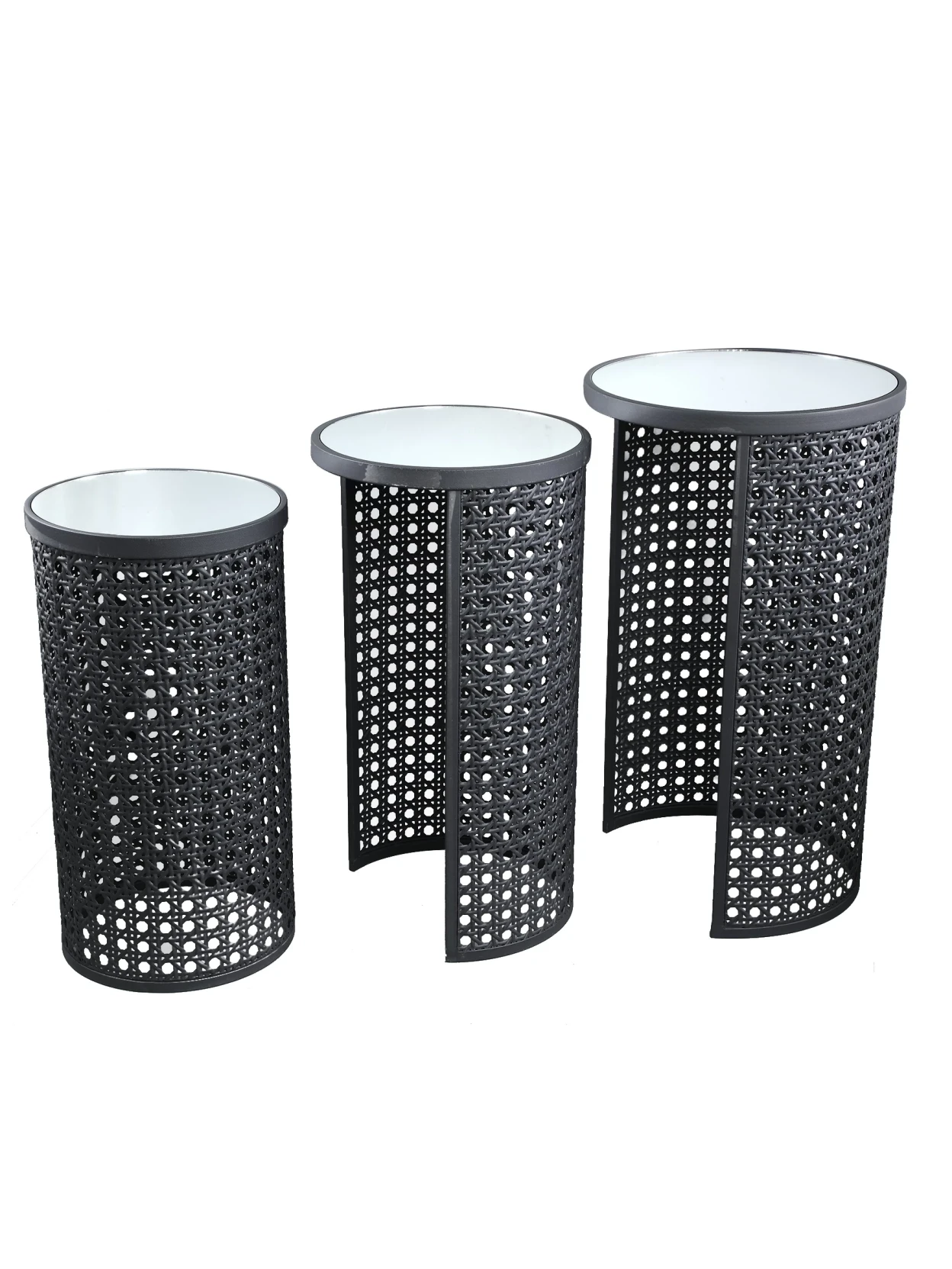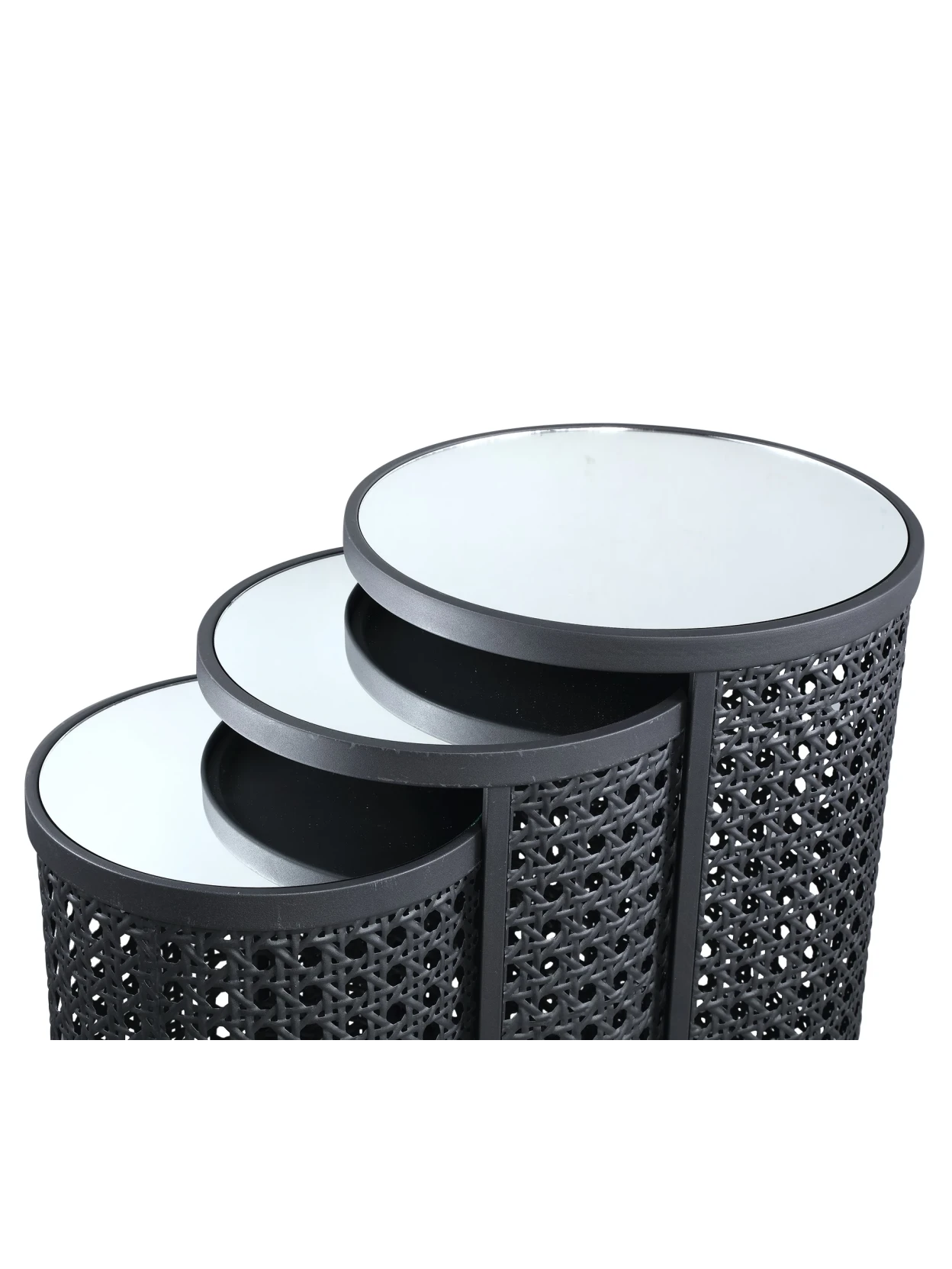 Il set di 3 tavolini Jinda di PTMD unisce eleganza moderna e design funzionale. Con struttura in metallo traforato grigio e piano a specchio, questi tavolini donano luce e stile a ogni ambiente, perfetti come coffee table o elementi decorativi raffinati.