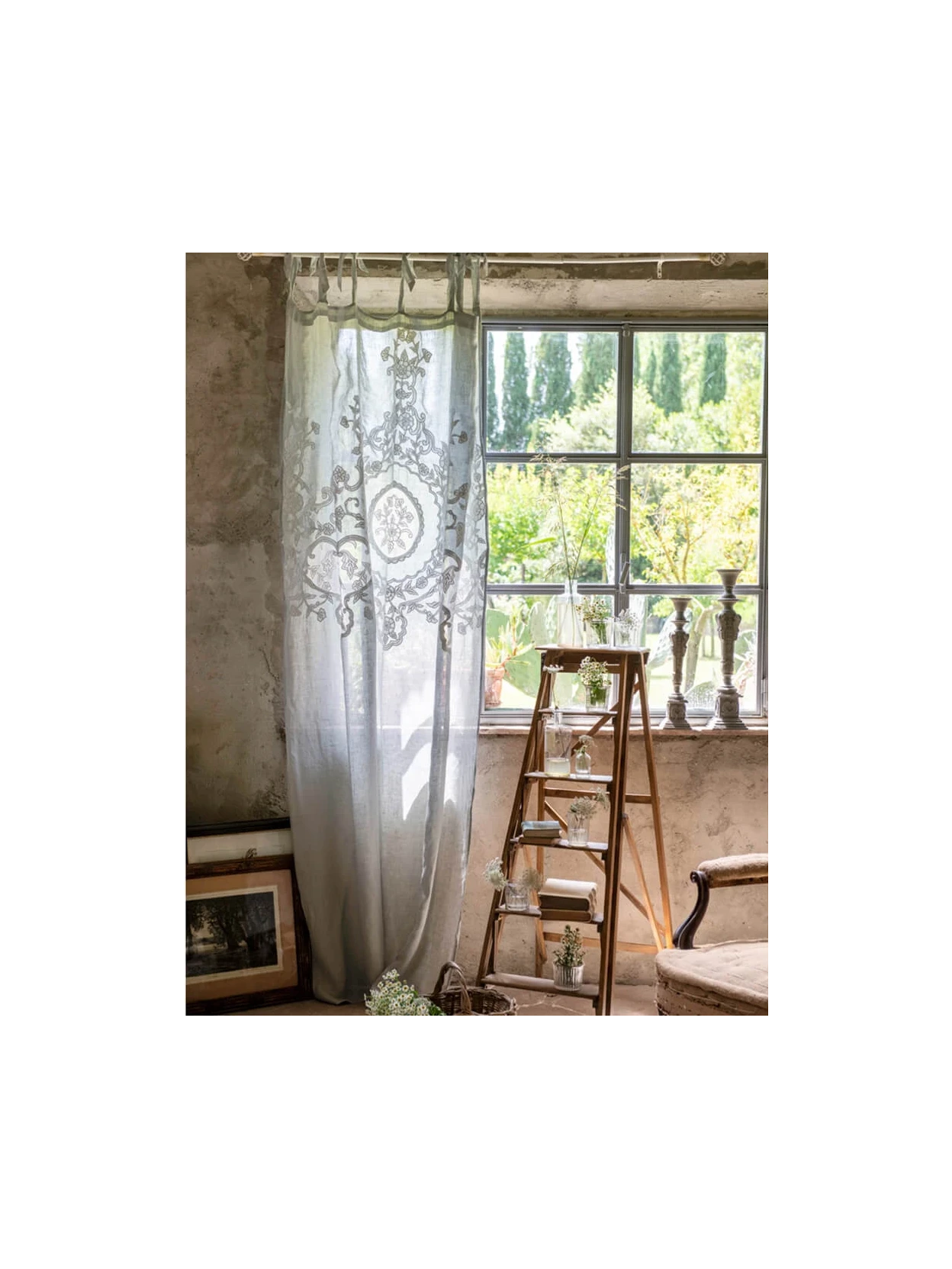 Elegante tenda in puro lino azzurro-grigio, con medaglione centrale bianco naturale e raffinati ricami. Perfetta per ambienti shabby chic e provenzali, si fissa facilmente ai bastoni con i pratici lacci, lasciando cadere morbidi drappeggi o delicati fiocchetti.