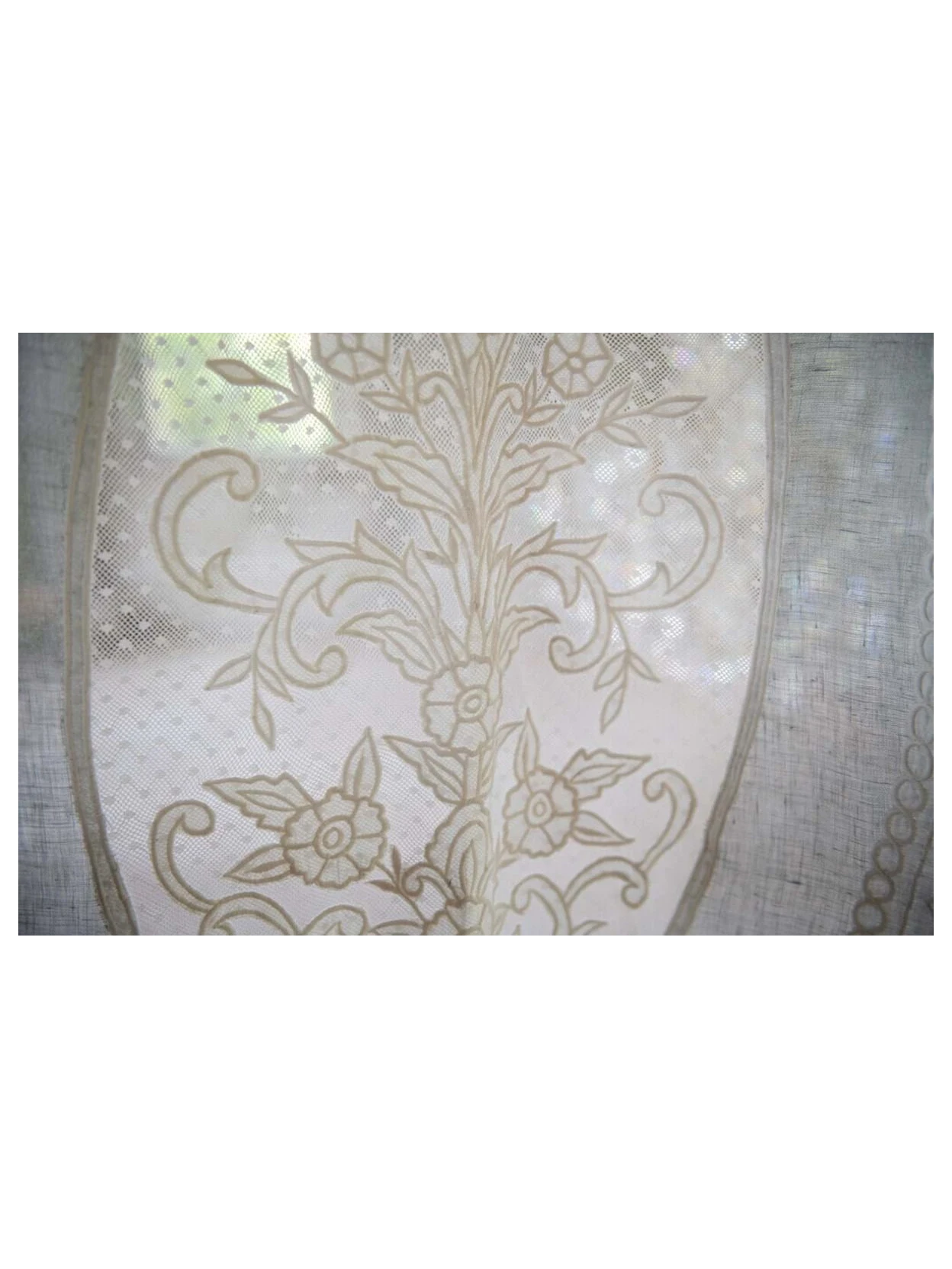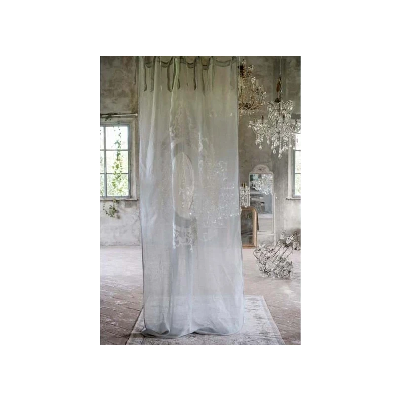 Scopri la bellezza della tenda Dentelle in 100% lino di Blanc Mariclò, color azzurro polvere tendente al grigio, impreziosita da un raffinato medaglione centrale bianco naturale e delicati ricami artigianali. Questa versione con lacci permette di appenderla facilmente al bastone, creando morbidi drappeggi o graziosi fiocchetti, trasformando ogni ambiente shabby chic in un rifugio elegante e romantico.