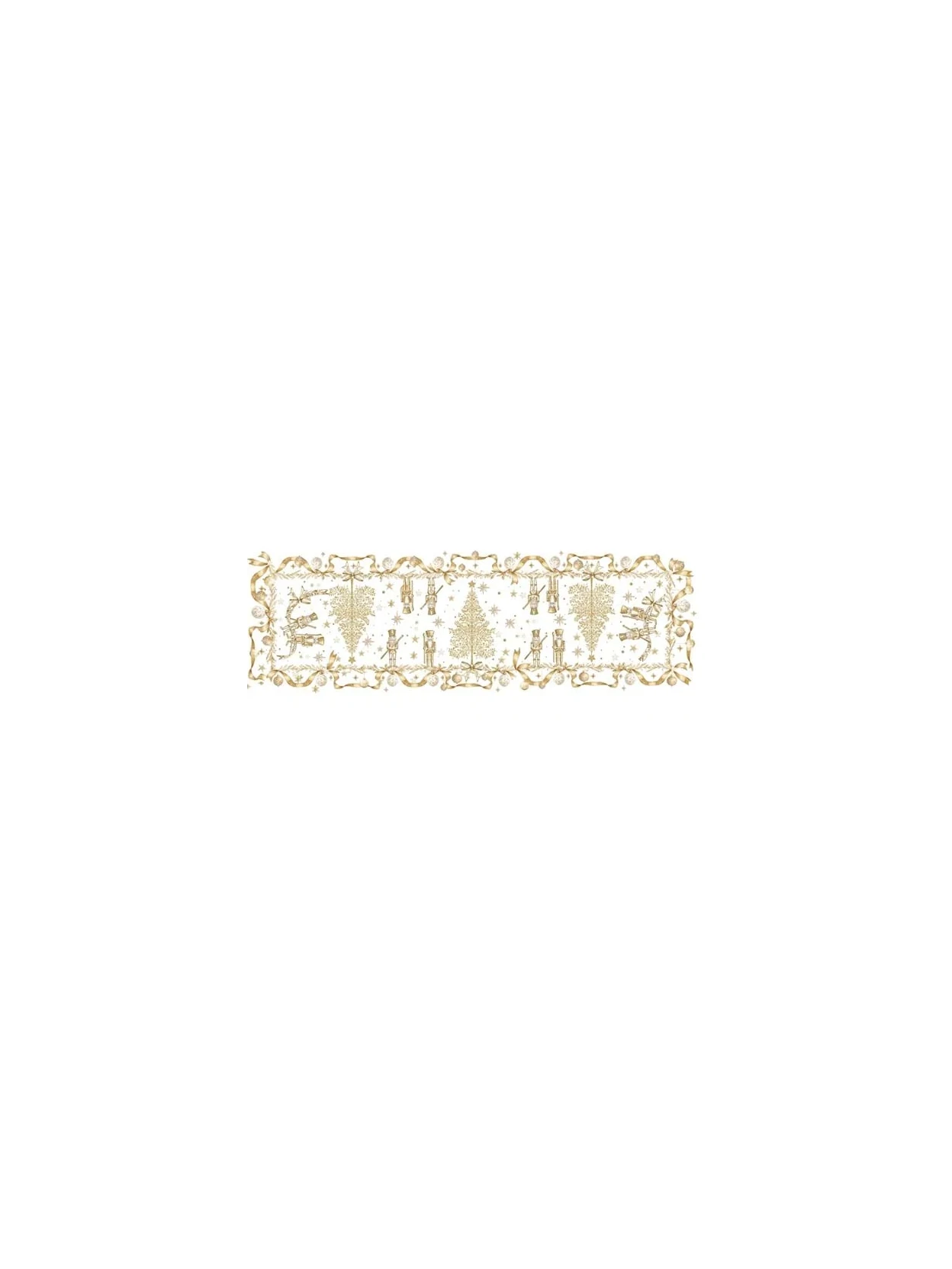 Runner in puro cotone, elegante e festivo, con raffinata stampa di rametti e fiocchi su fondo avorio.