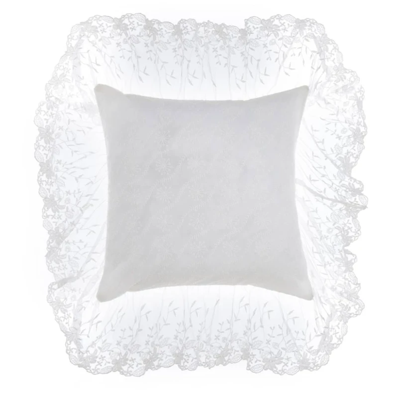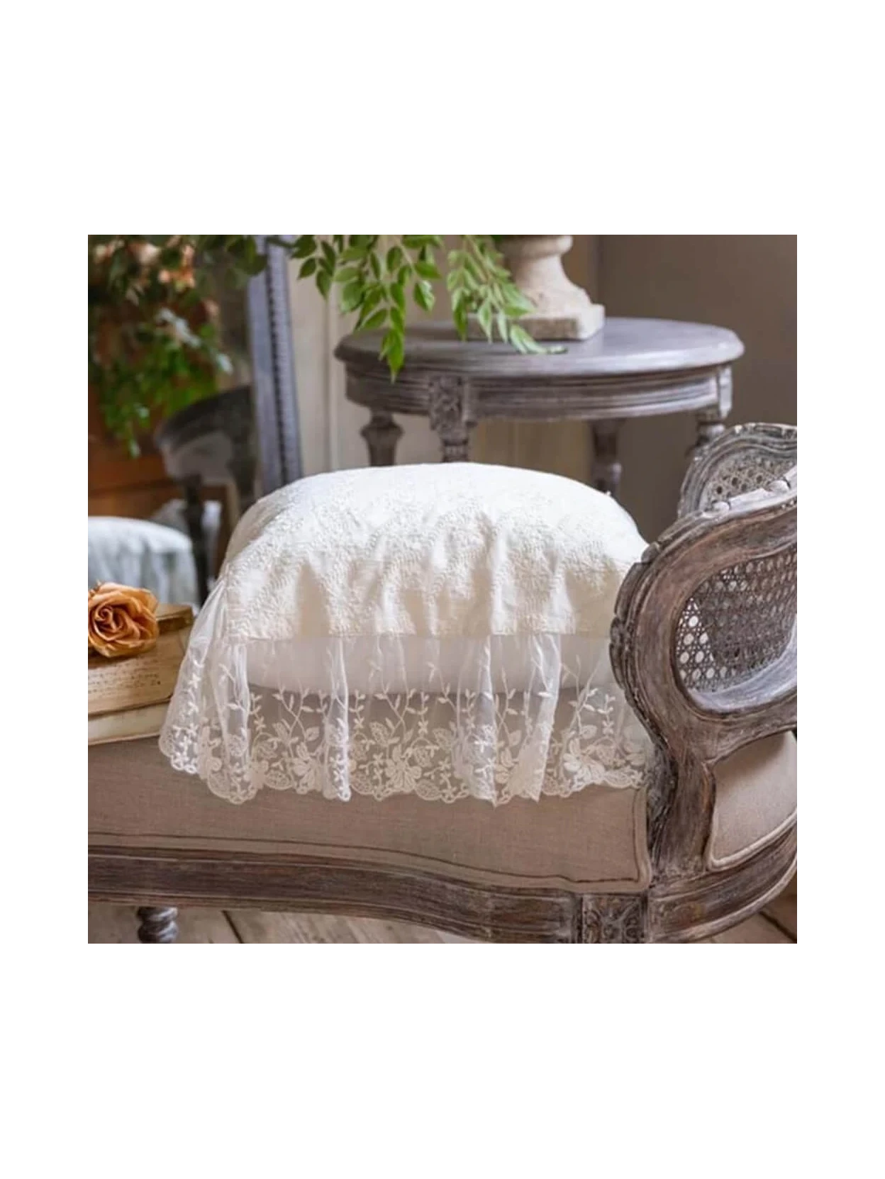 Elegante cuscino della collezione Dentelle in 100% cotone bianco, con morbida imbottitura e raffinato contorno di gale in pizzo floreale. Perfetto per aggiungere un tocco romantico e shabby chic a camere, soggiorni o salotti.