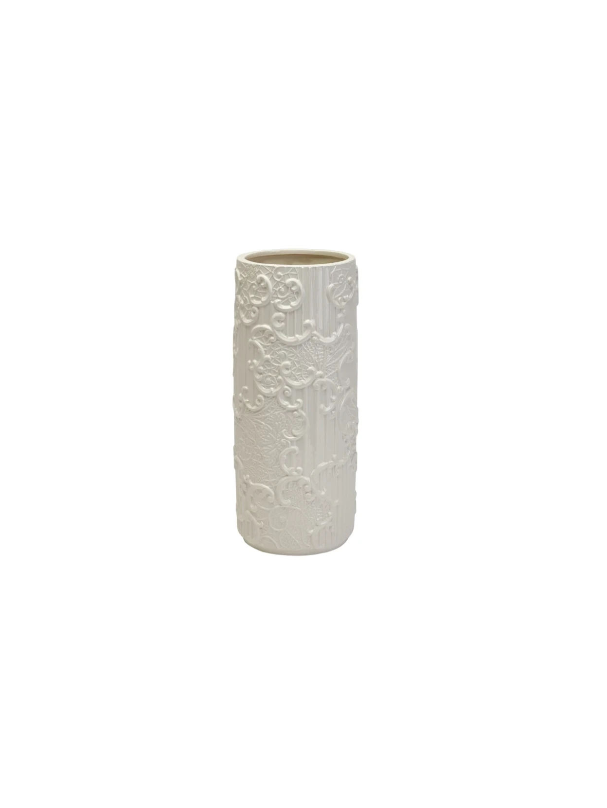 Vaso cilindrico Dentelle di Henriette in ceramica bianca, Ø13,5 x H33 cm. Elegante e raffinato, perfetto per fiori freschi o come elemento decorativo da solo.
