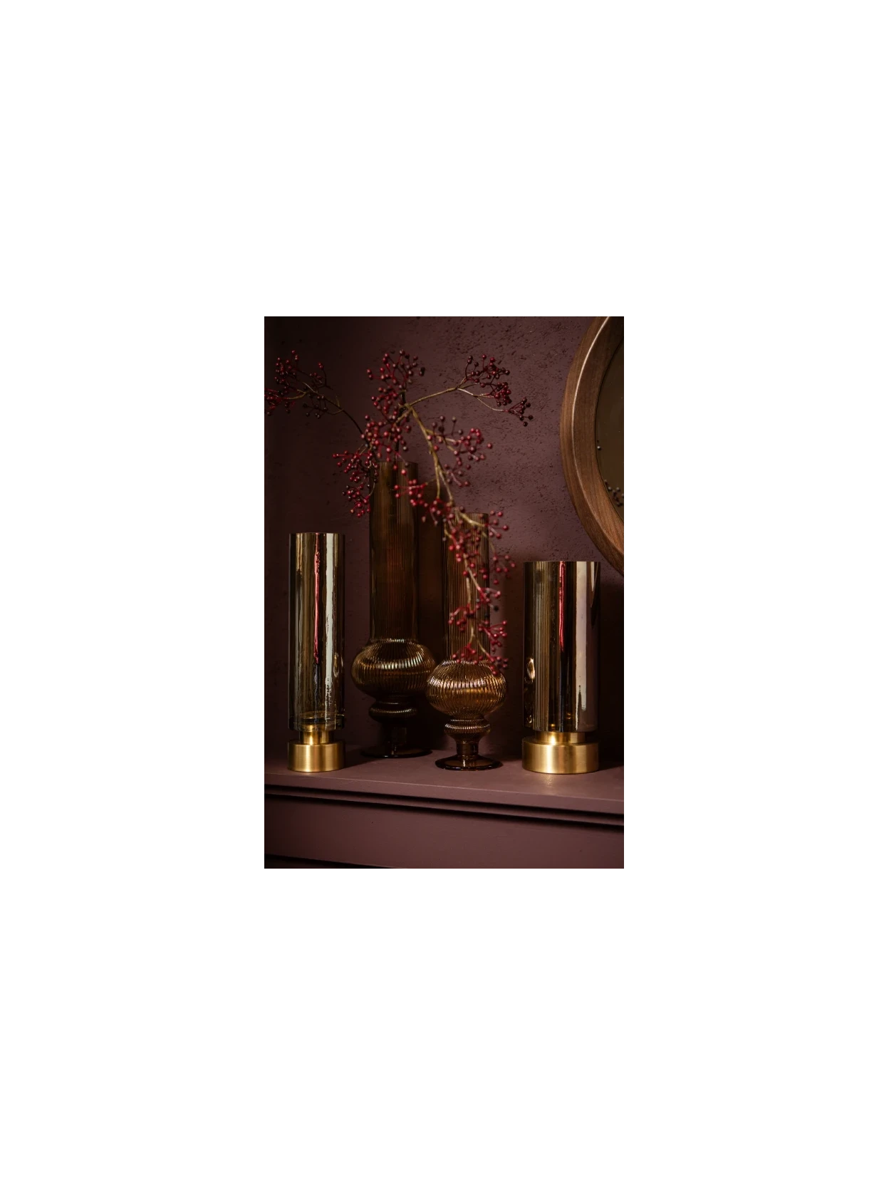 Il vaso Morrible di PTMD in vetro ambrato e metallo dorato è un elegante complemento d’arredo realizzato a mano. Utilizzabile anche come portacandela, dona calore e raffinatezza a ogni ambiente.