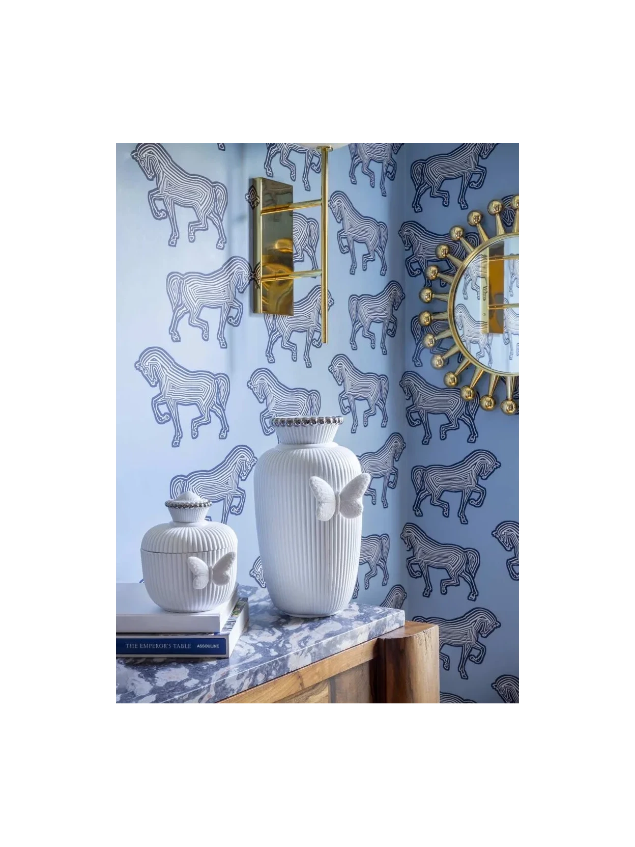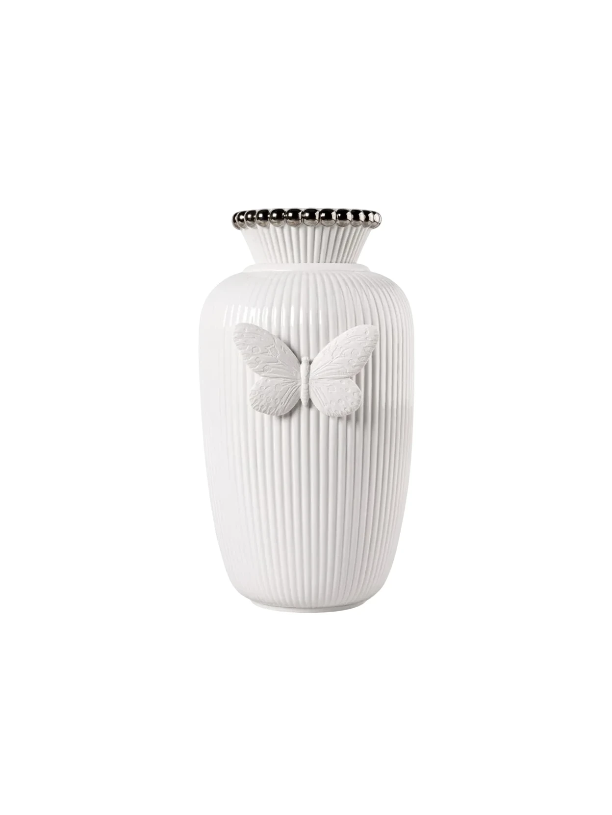 Il vaso Lady Luck, creato dalla designer Olga Hanono, è un capolavoro di porcellana contemporanea che unisce estetica, simbolismo e artigianalità. La sua silhouette ondulata, realizzata in porcellana bianca opaca, crea un movimento sinuoso e armonioso, mentre la farfalla applicata; emblema di trasformazione, rinascita e buona fortuna aggiunge un tocco poetico e altamente decorativo. Ogni dettaglio è curato con precisione dal Dept. Diseño y Decoración, che trasforma questo vaso in un oggetto funzionale ma dal forte impatto artistico. La finitura alterna superfici matt, gloss e riflessi metallici, conferendo profondità materica e un’eleganza sofisticata.